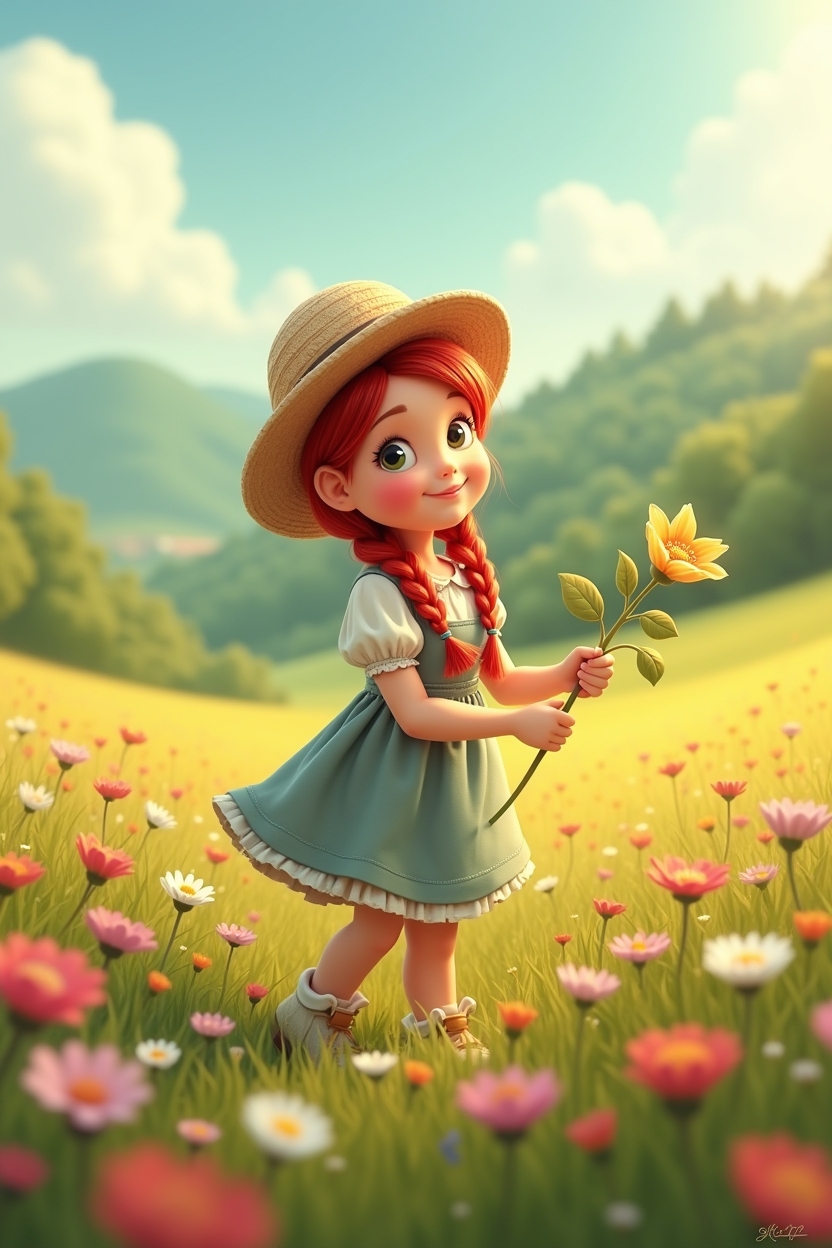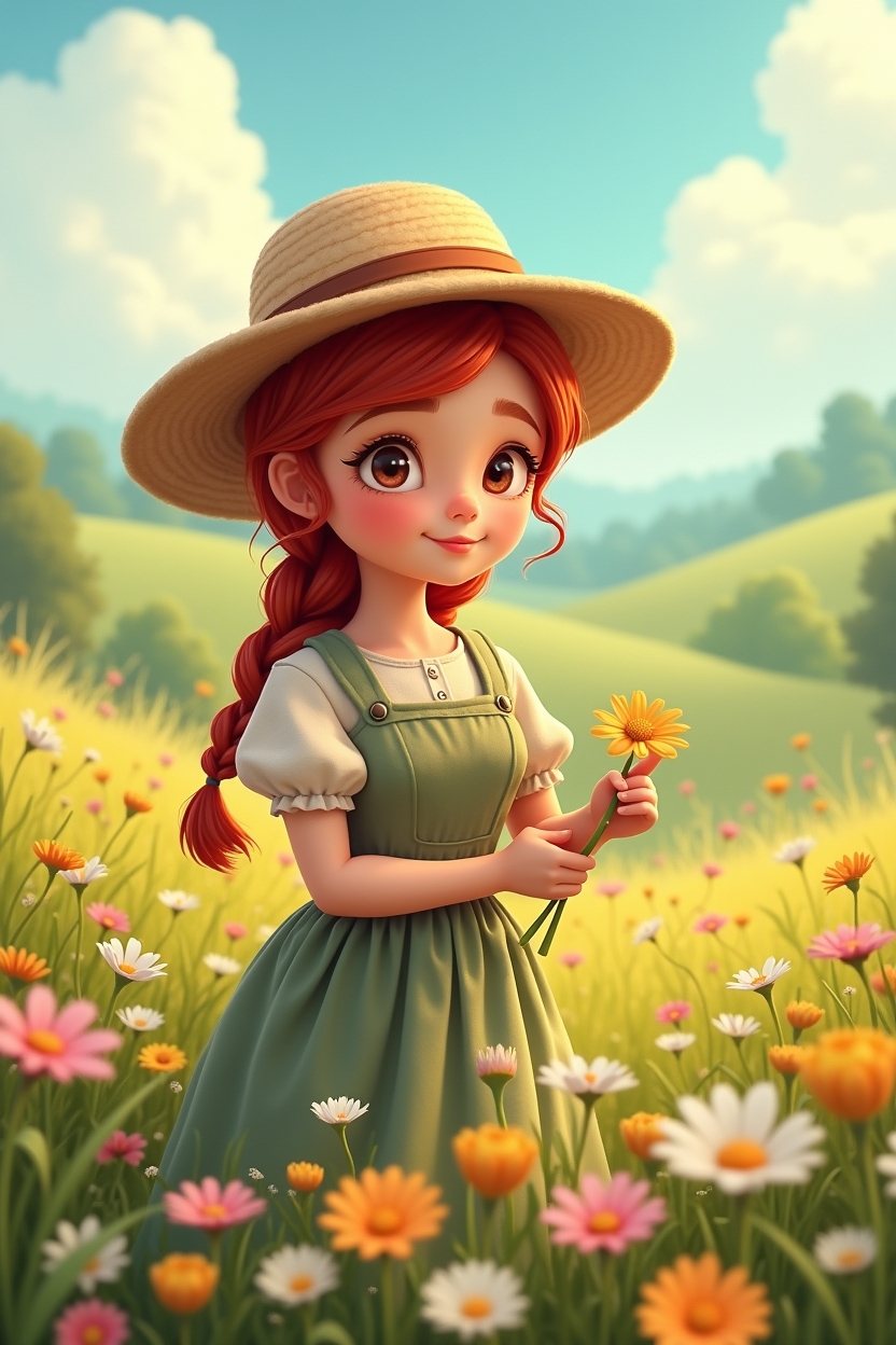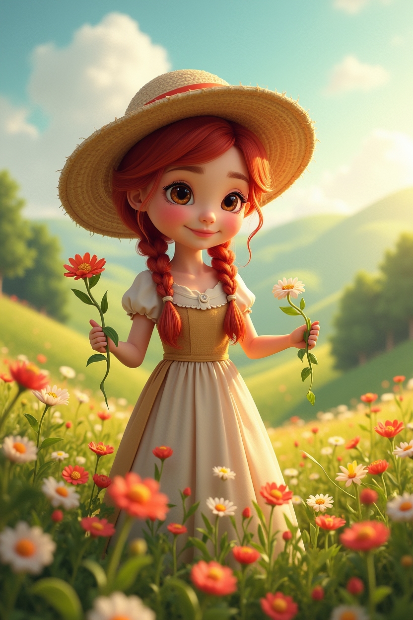 This charming animated illustration features a young girl with red braided hair standing in a vibrant field of flowers. She wears a wide-brimmed straw hat, a light green dress, and sandals, holding a small bouquet of white daisies with a warm, joyful smile. The flower field is rich in pink and white tones, stretching into rolling green hills beneath a bright blue sky dotted with fluffy clouds. The lighting suggests a sunny, carefree day, enhancing the idyllic and cheerful mood. The style is reminiscent of storybook animation, with soft textures and vivid colors that evoke innocence, nature, and happiness—perfect for prompts focused on pastoral scenes, childhood, or seasonal joy.