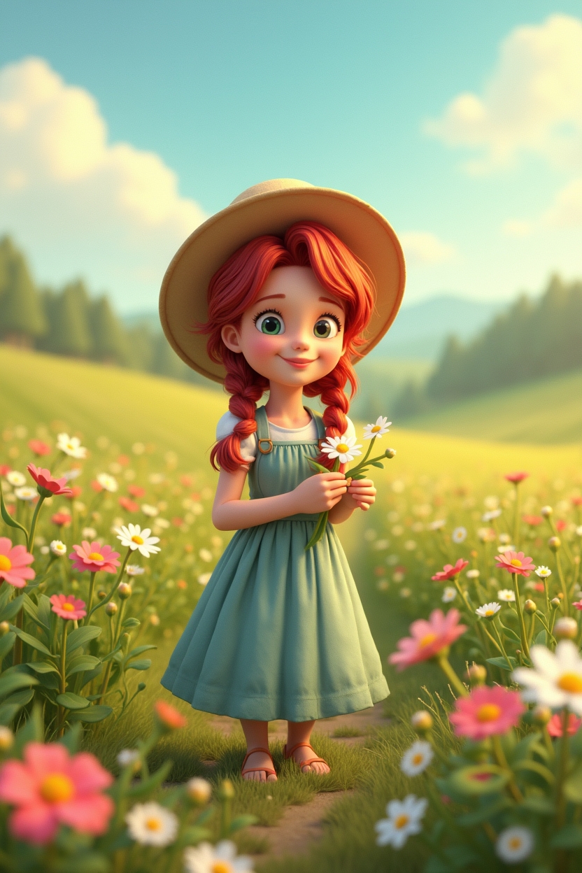 This charming animated illustration features a young girl with red braided hair standing in a vibrant field of flowers. She wears a wide-brimmed straw hat, a light green dress, and sandals, holding a small bouquet of white daisies with a warm, joyful smile. The flower field is rich in pink and white tones, stretching into rolling green hills beneath a bright blue sky dotted with fluffy clouds. The lighting suggests a sunny, carefree day, enhancing the idyllic and cheerful mood. The style is reminiscent of storybook animation, with soft textures and vivid colors that evoke innocence, nature, and happiness—perfect for prompts focused on pastoral scenes, childhood, or seasonal joy.