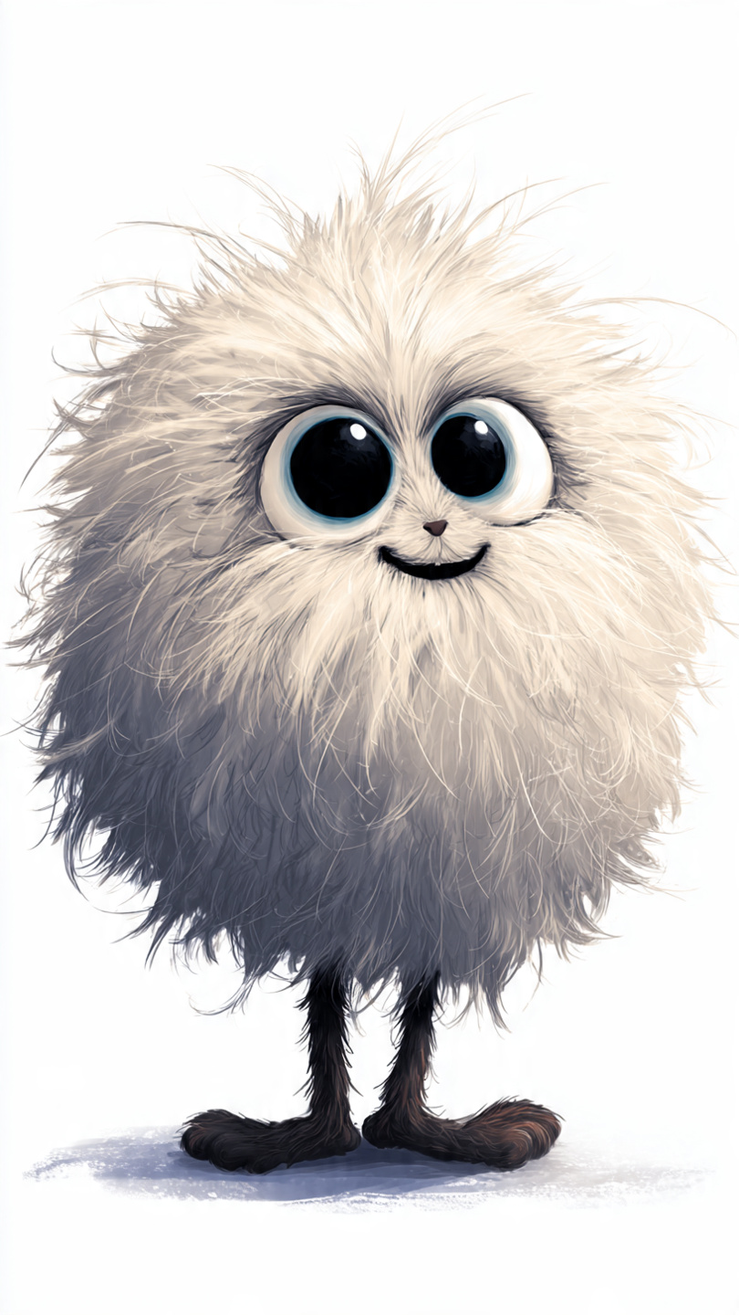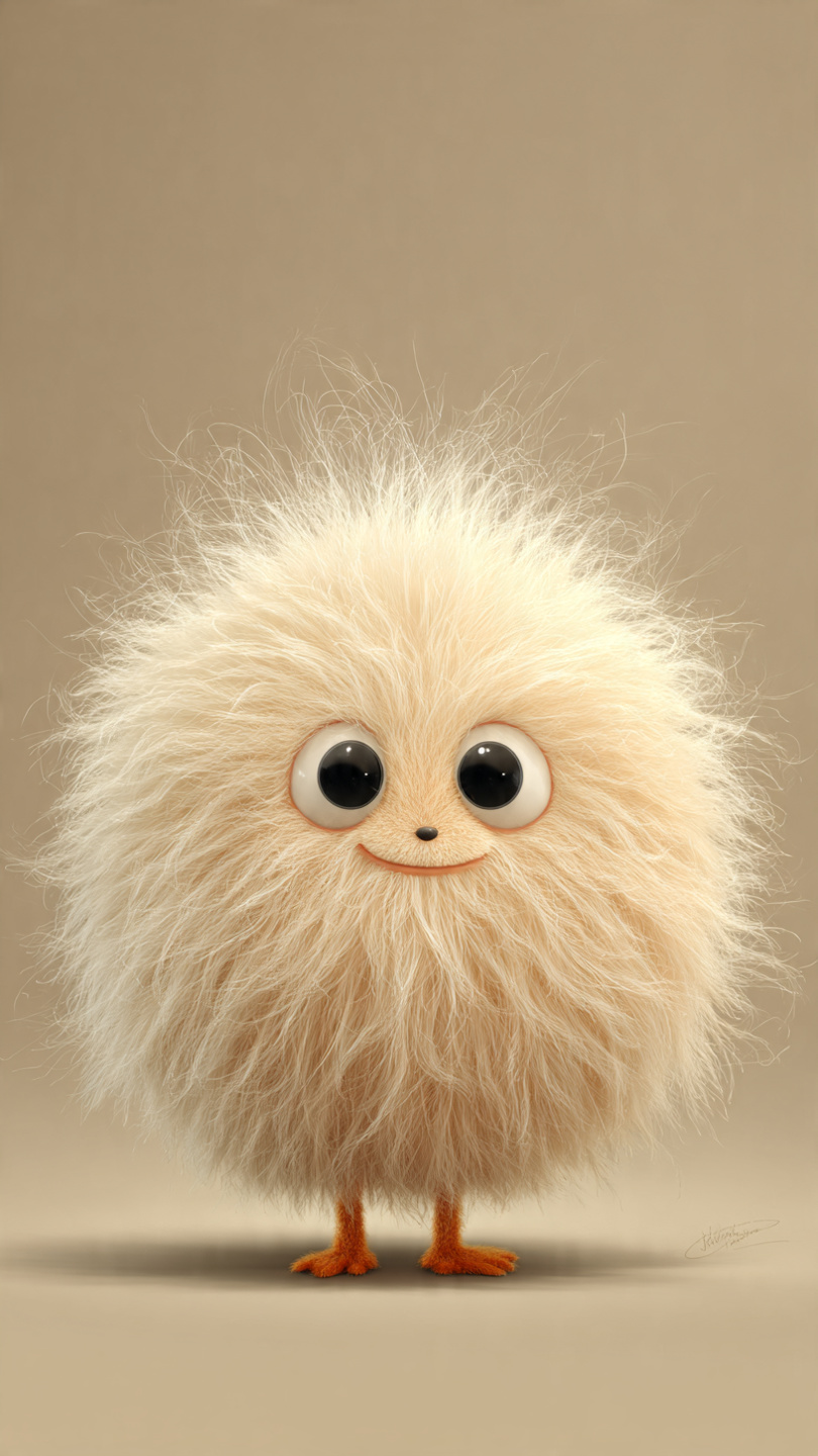 This whimsical digital illustration features a fluffy, round creature with vibrant orange fur and an endearing expression. Its oversized glossy black eyes with white irises and tiny black smile give it a playful, innocent charm. The creature stands on thin black legs with small feet, adding to its quirky proportions. Set against a neutral beige background, the bright orange body pops visually, emphasizing its cartoon-like appeal. The soft textures and simple shapes suggest a character designed for children’s media, mascots, or animated storytelling. The overall style is clean, expressive, and emotionally engaging—perfect for prompts focused on cute character design or imaginative creatures.