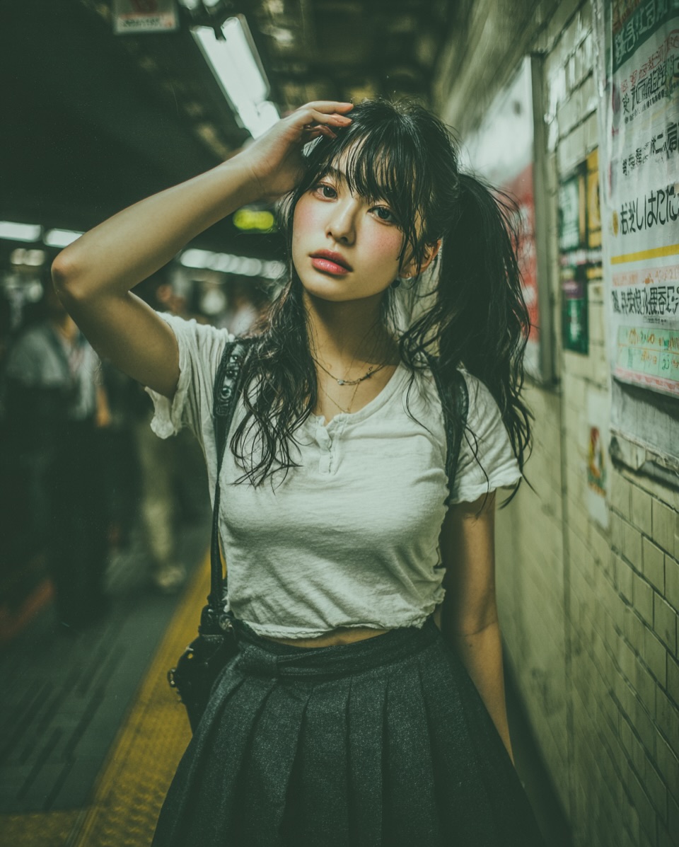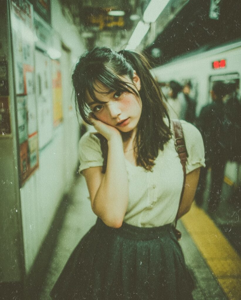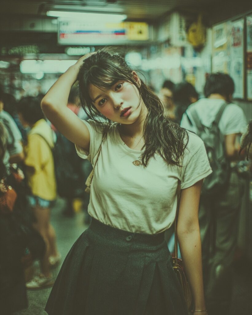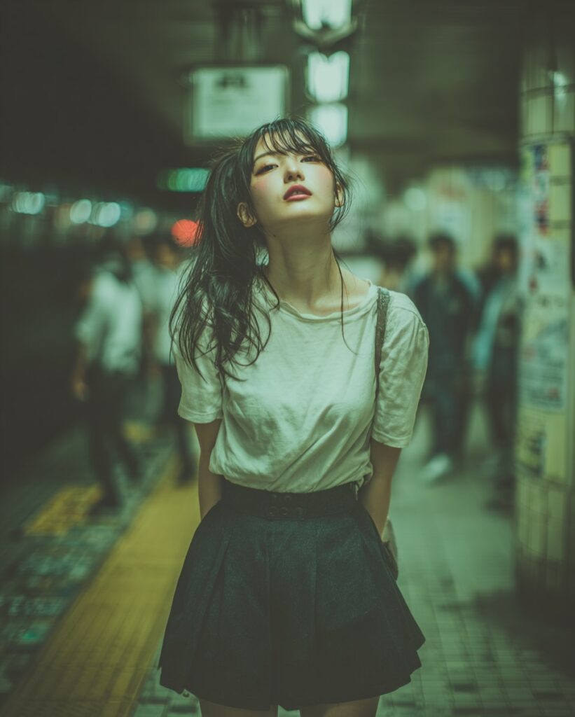 This image channels a moody, cinematic street style with strong urban storytelling. The lighting is low and fluorescent, casting a greenish tint that enhances the gritty, underground atmosphere. The shallow depth of field isolates the subject from the bustling background, creating a sense of introspection amid chaos. The color grading leans toward cool tones with high contrast, giving the photo a dramatic, filmic quality. The composition is intimate and slightly off-center, adding a candid, documentary-like feel. Overall, the style evokes themes of youth, solitude, and movement, making it ideal for prompts focused on emotional realism and urban aesthetics.