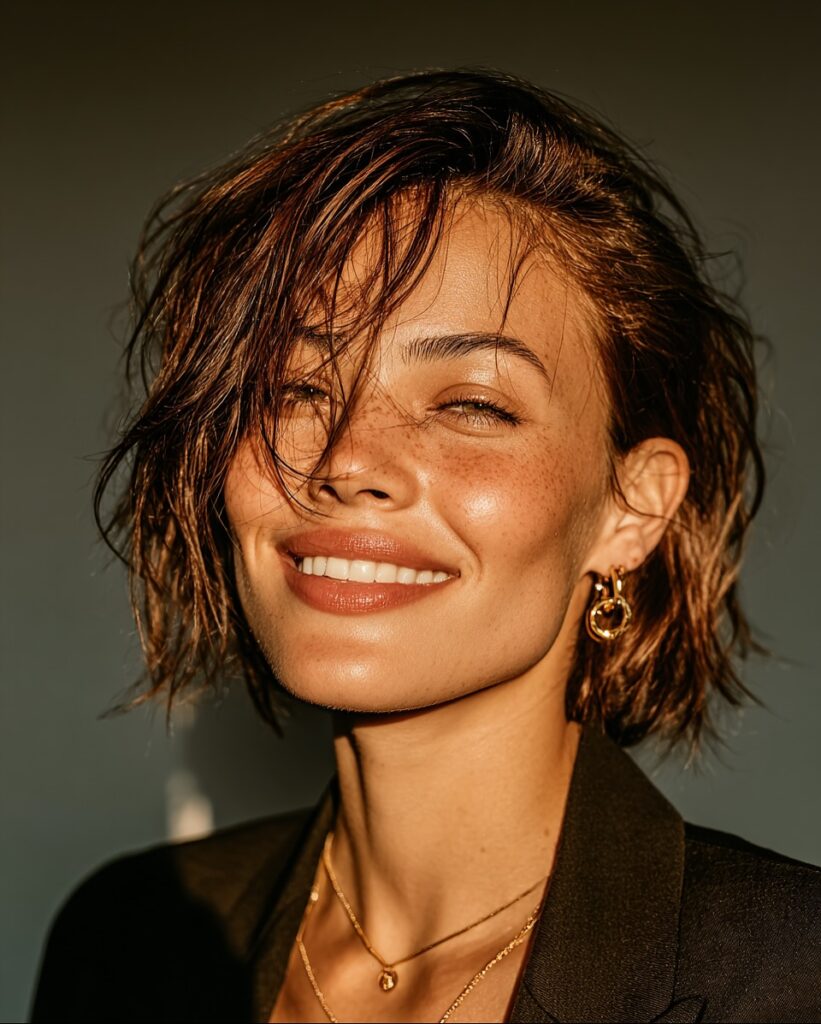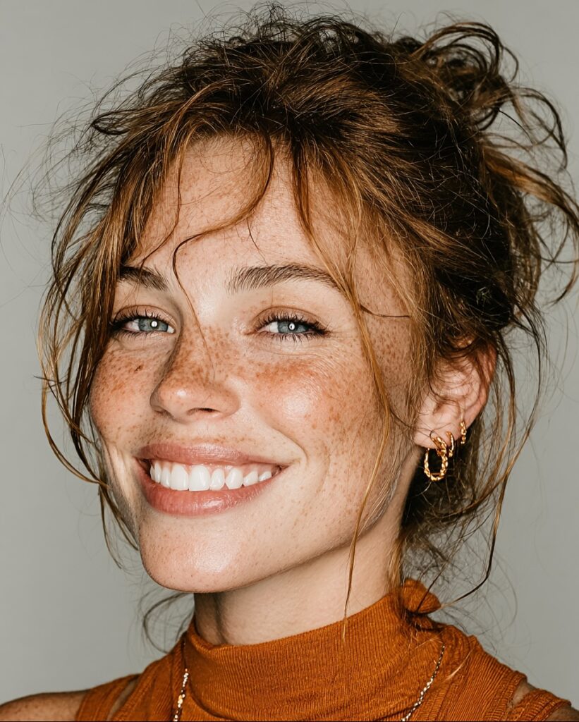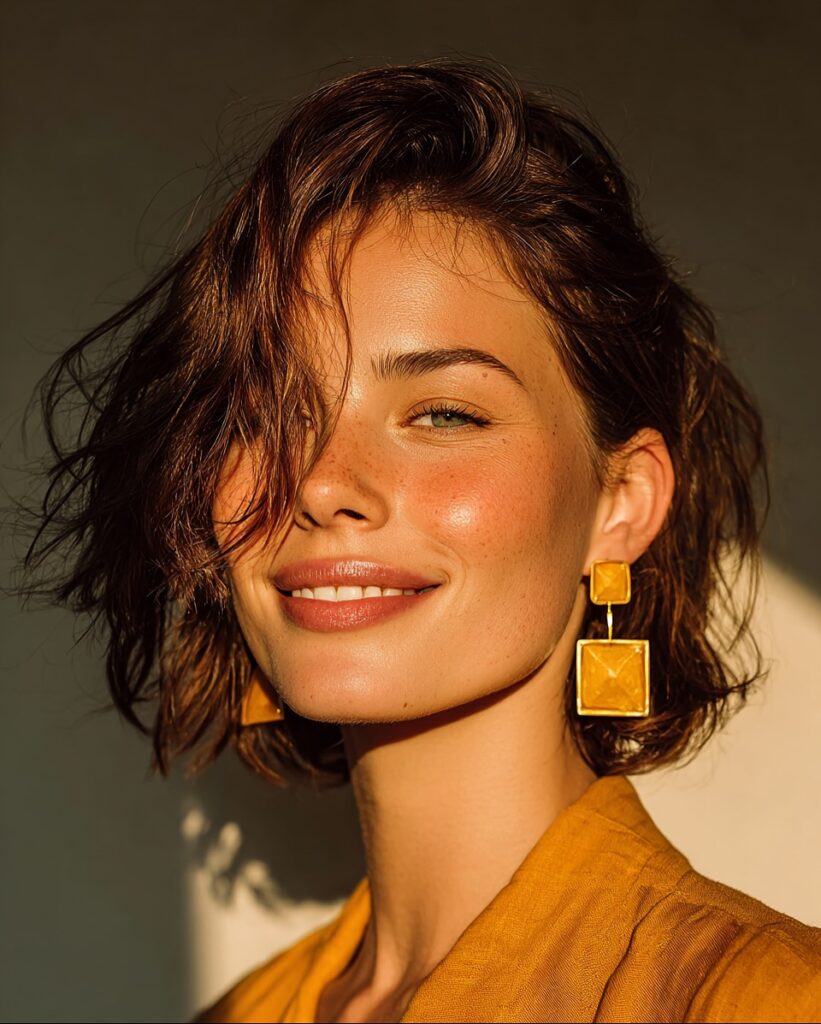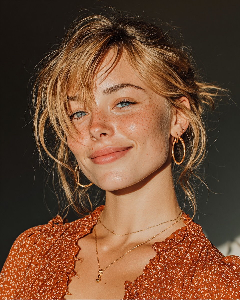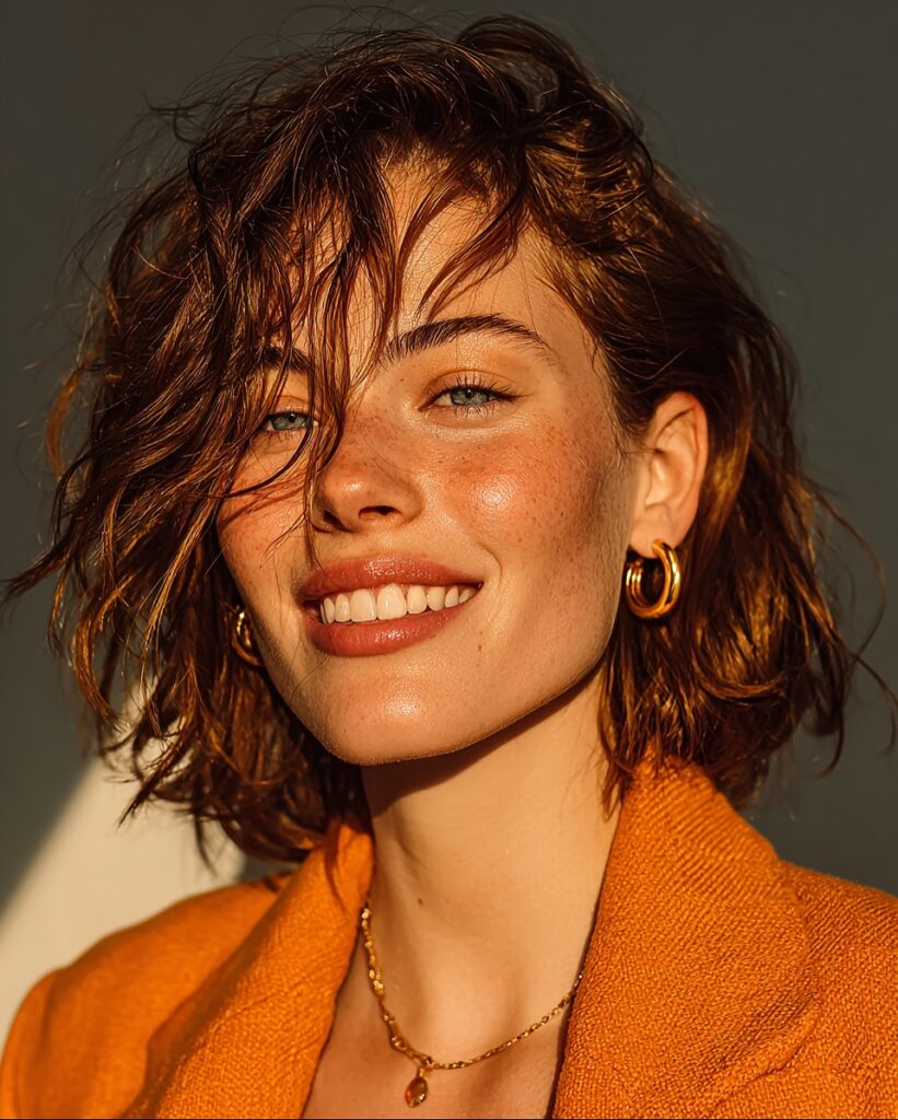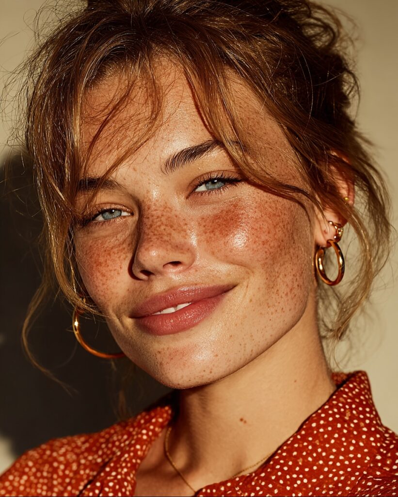 This image embraces a warm editorial aesthetic with a soft, cinematic finish. The lighting is natural and directional, creating gentle highlights and shadows that add depth and intimacy. The color grading leans into earthy tones, with a rich contrast that enhances the warmth of the palette. The composition is tight and centered, drawing focus to texture and detail while maintaining a relaxed elegance. The blurred face introduces a sense of anonymity and universality, making the styling the central narrative. Overall, the photo evokes a blend of lifestyle photography and fashion lookbook, ideal for prompts that explore mood, tone, and visual storytelling.