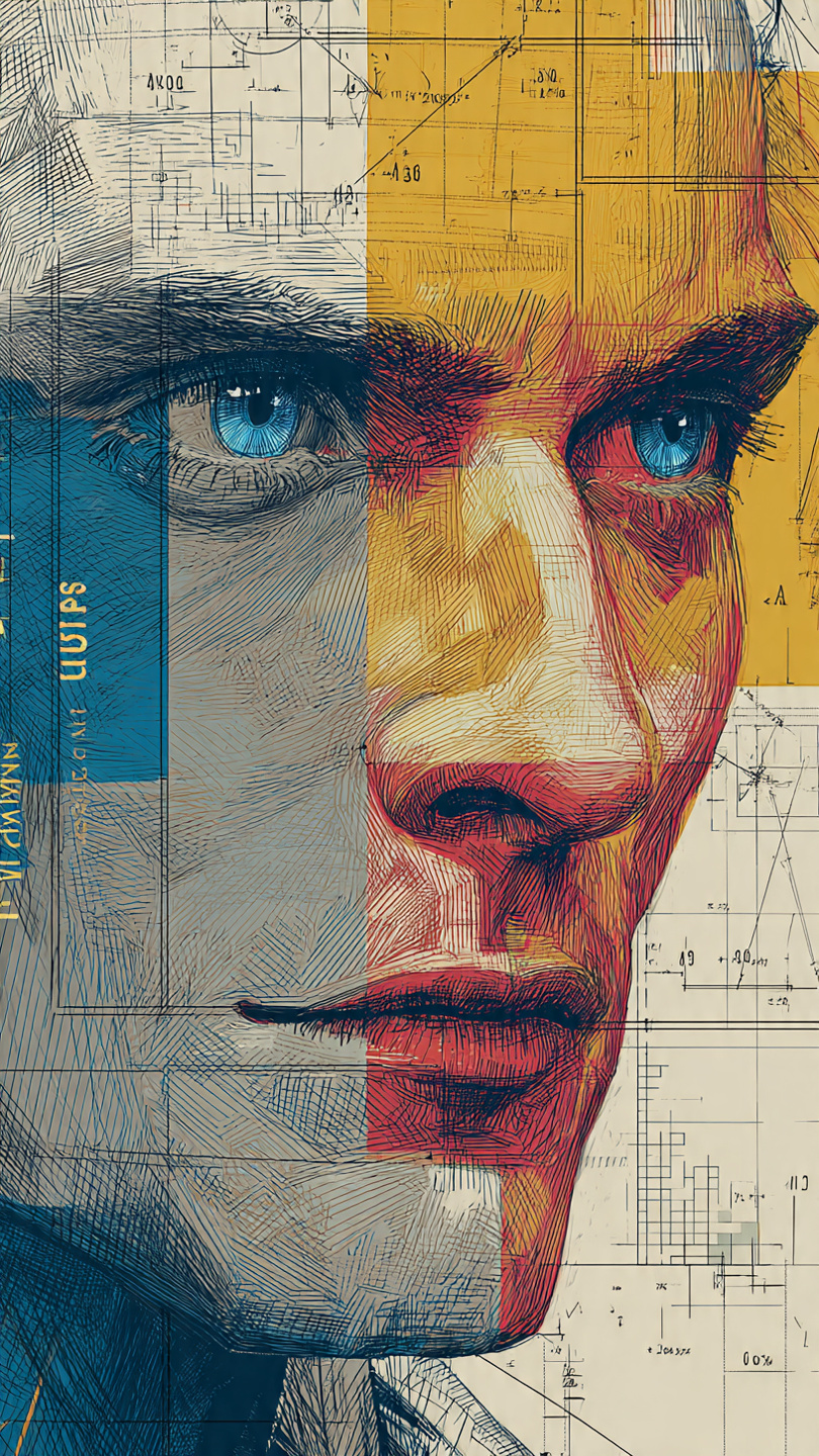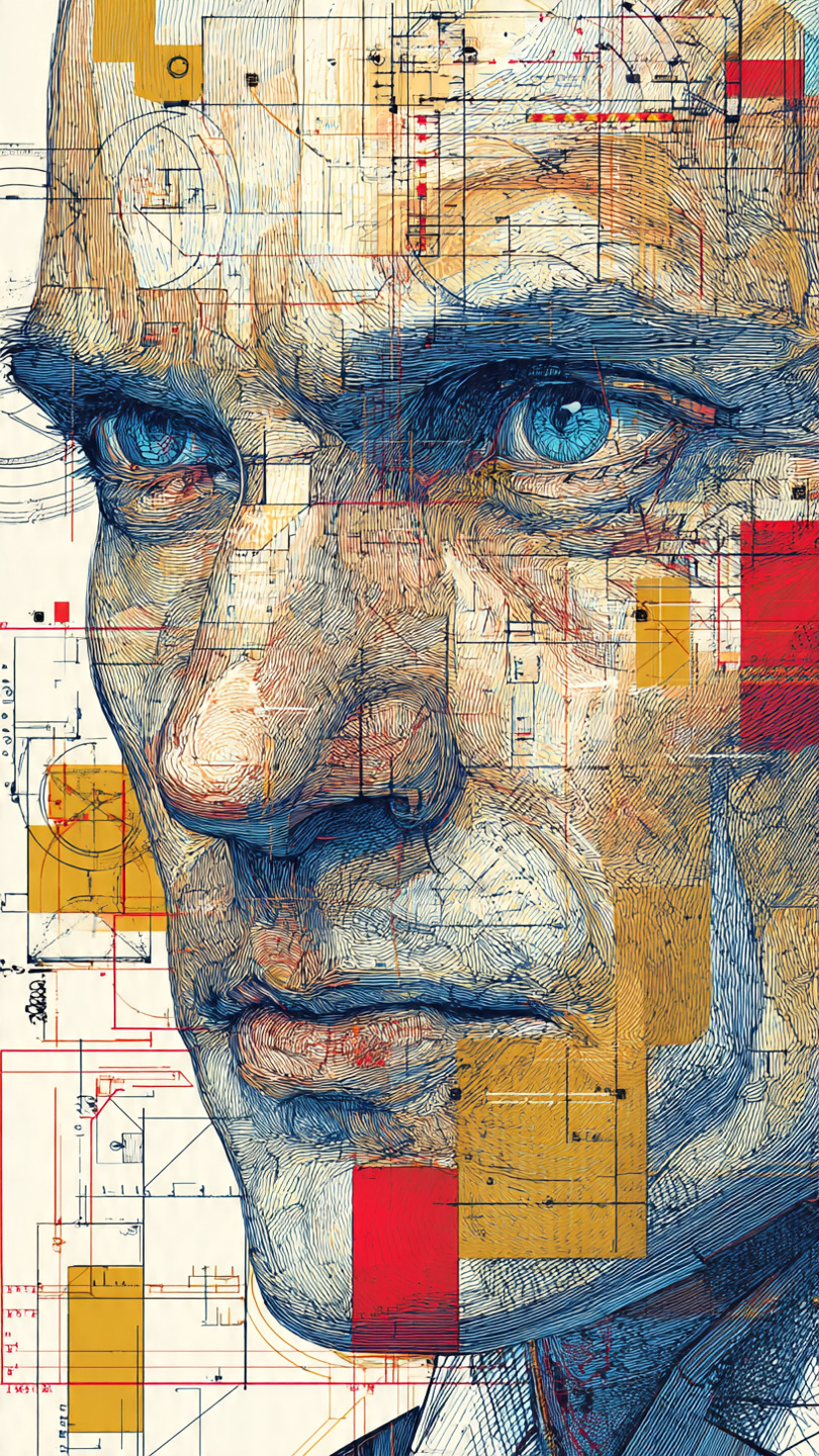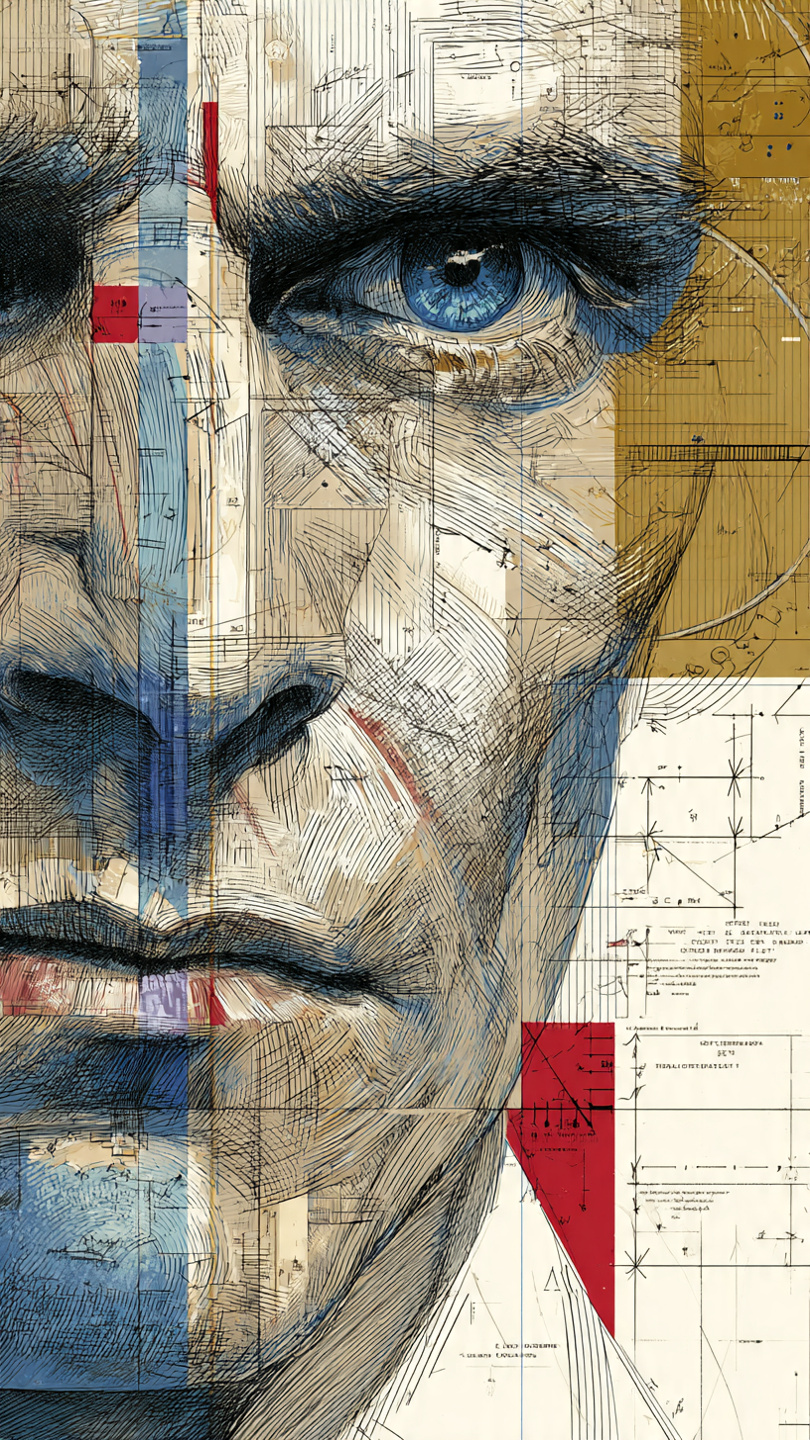 This visually arresting illustration merges a hyper-detailed portrait of a man with abstract scientific and mathematical overlays. His intense gaze and piercing blue eyes convey focus and intellect, while his face is interwoven with geometric shapes, technical schematics, and labeled diagrams. The composition uses layered grids, angles, and circular forms to evoke themes of analysis, engineering, and cognitive complexity. The color palette—dominated by blues, reds, yellows, and neutrals—creates a striking contrast between human emotion and mechanical precision. The style blends realism with conceptual abstraction, making it ideal for prompts exploring the fusion of humanity and technology, analytical thinking, or visionary design.