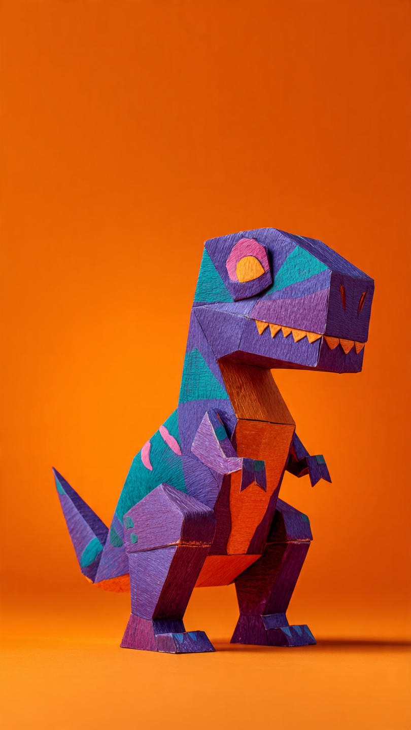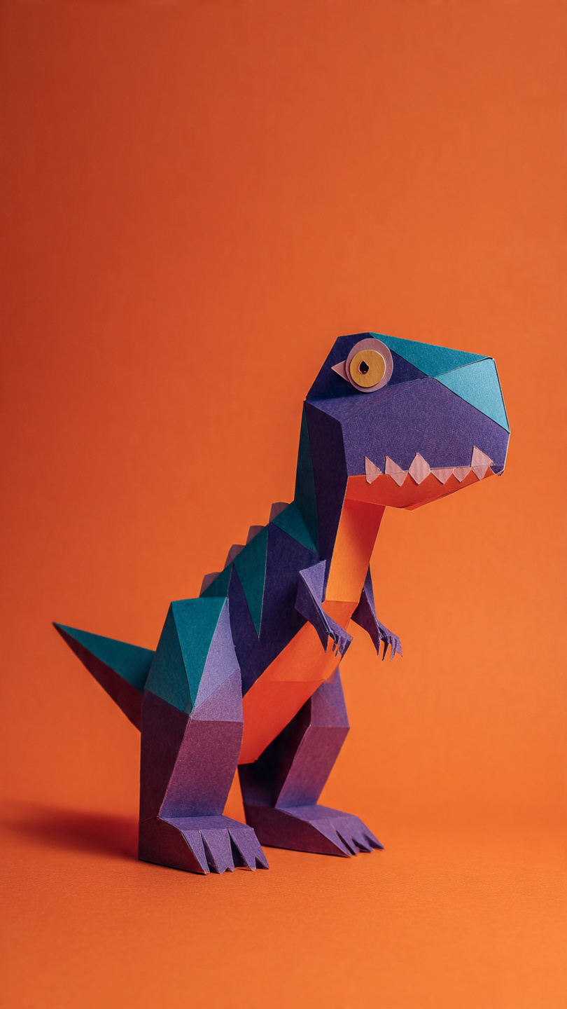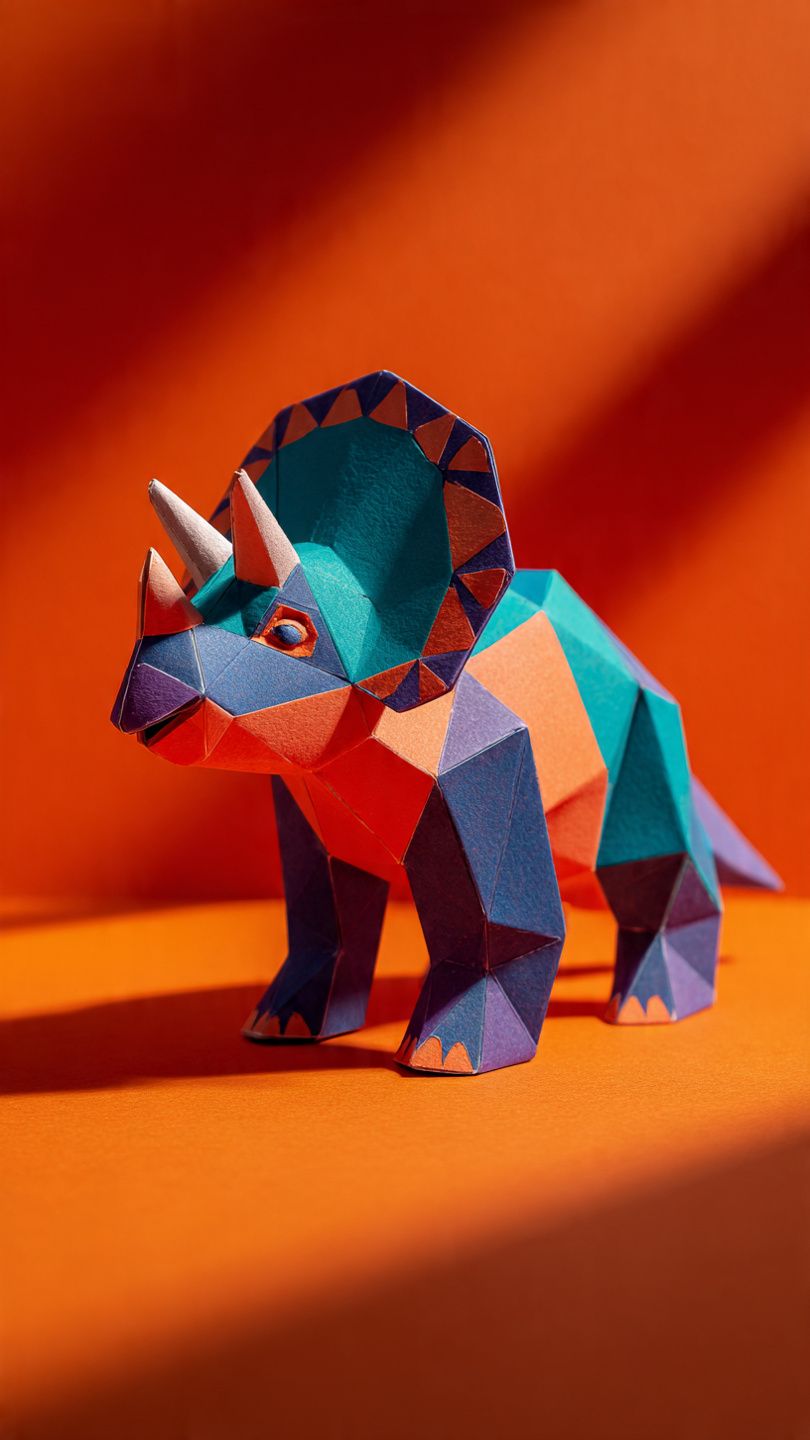 This vibrant illustration showcases a geometric paper model of a dinosaur, crafted with bold polygonal shapes that give it a faceted, origami-inspired appearance. The dinosaur features three prominent horns, a frilled crest, and sturdy legs, rendered in a dynamic color palette of blue, teal, orange, and purple. Set against a solid orange background, the contrast enhances the playful and modern aesthetic. The stylized design merges prehistoric themes with contemporary paper craft, creating a visually striking and imaginative piece. Ideal for prompts focused on low-poly modeling, creative sculpture, or educational visuals with a fun twist.
