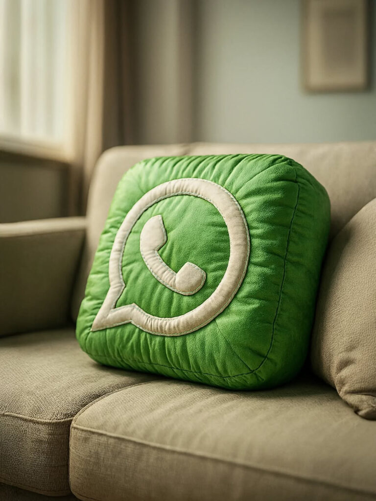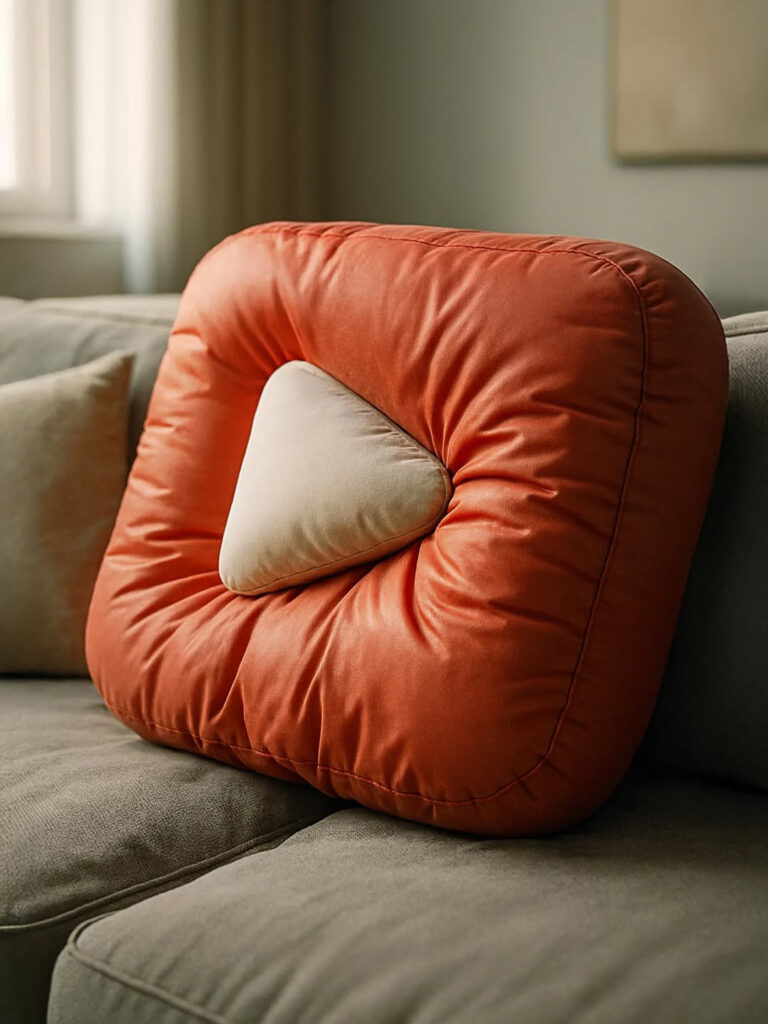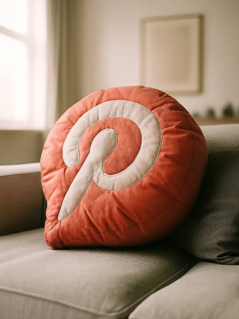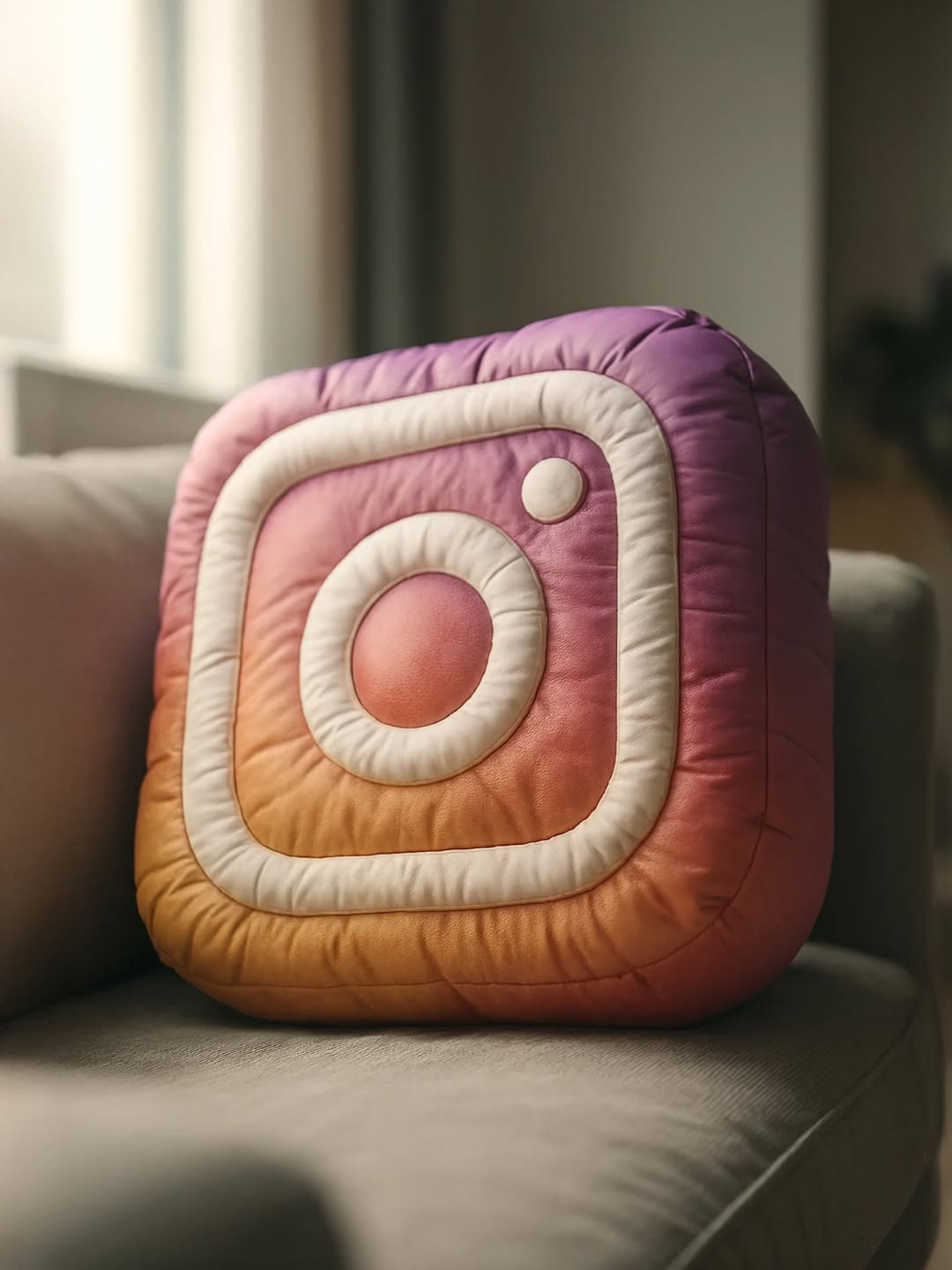 This image features a playful and modern product-style composition centered around a pillow shaped like the logo. The pillow, with rounded edges and a soft texture, sits on a neutral-toned sofa in a cozy, softly lit living room. The contrast between the vibrant color of the logo and the beige background draws attention to the iconic symbol. The overall aesthetic is clean and minimal, with a lifestyle branding feel that merges comfort with tech culture. The lighting is natural and diffused, enhancing the tactile quality of the pillow and creating a warm, inviting atmosphere. It’s a clever fusion of digital identity and home decor.