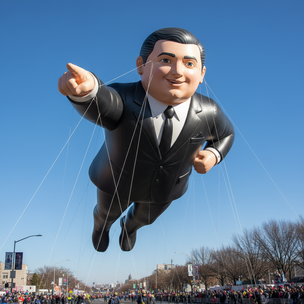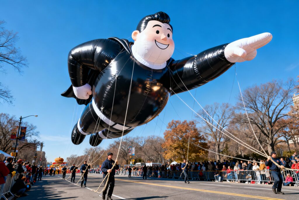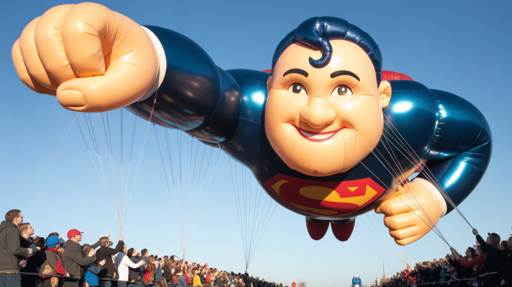 The image style embodies a bright, hyperreal aesthetic typical of large-scale event photography. The colors are crisp and saturated, with sharp contrasts under clear daylight, creating a sense of clarity and celebration. The composition emphasizes scale and spectacle, capturing the monumental size of the balloon against the vivid blue sky. The perspective and framing enhance the feeling of grandeur and festivity, while maintaining documentary realism. The overall look combines the playful energy of pop culture imagery with the precision and vibrancy of professional outdoor photography.