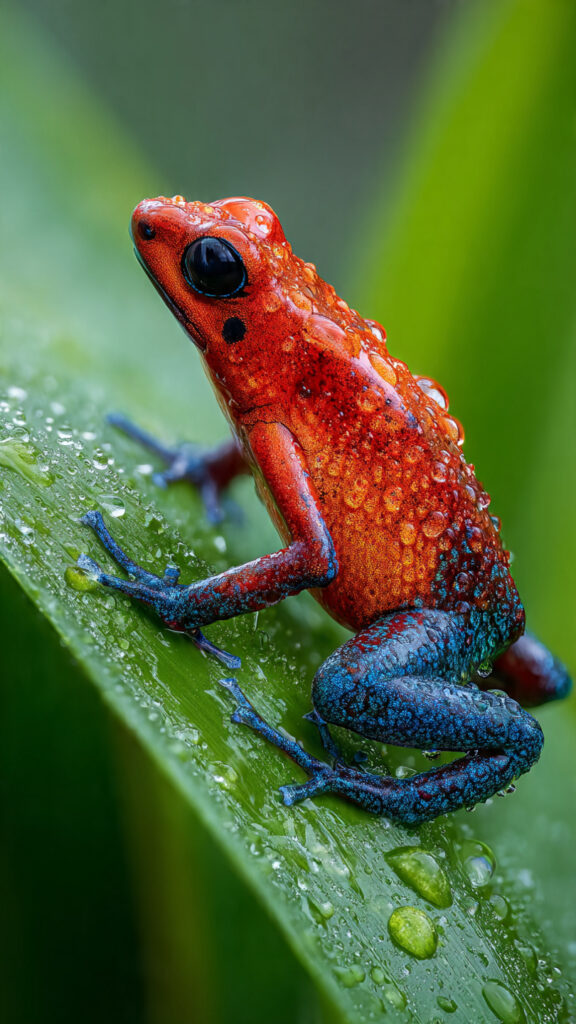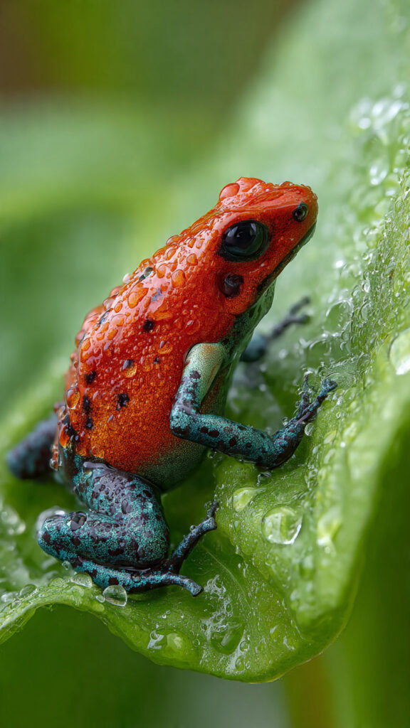 The images presents a striking macro photograph of a vividly colored frog perched on a dewy green leaf. The style focuses on hyperrealistic detail, showcasing the intricate texture of the frog’s skin, the reflections within the water droplets, and the vibrant contrast between the red, turquoise, orange, and violet hues. The shallow depth of field isolates the subject against a smooth, blurred background, emphasizing clarity and precision. The lighting is soft yet directional, enhancing the glossy, wet surfaces and giving the scene a luminous, almost surreal quality. This visual approach merges scientific realism with artistic intensity, highlighting nature’s microscopic beauty in a highly polished, photographic style.