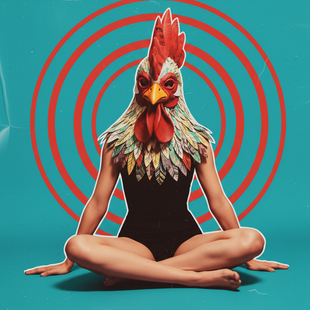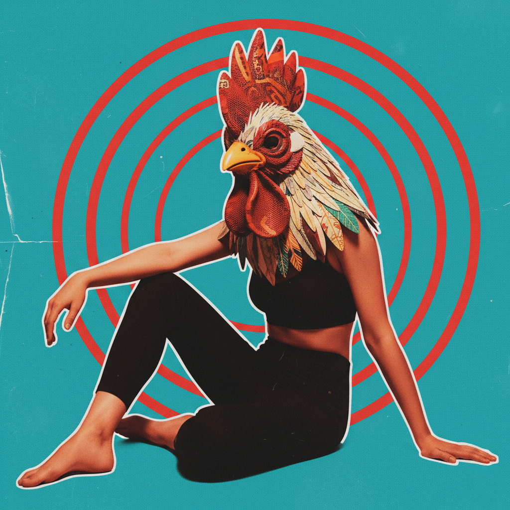This surreal and visually arresting composition blends human and animal elements in a bold, graphic style. A person sits cross-legged against a turquoise backdrop, their body seamlessly fused with the head of a rooster. The feathers are intricately detailed, forming a vibrant collar that merges into the black sleeveless outfit. Behind the figure, concentric red circles radiate outward, creating a hypnotic, psychedelic effect that draws the viewer’s gaze to the center. The color palette is vivid and high-contrast, enhancing the dreamlike and slightly absurd tone. The overall aesthetic evokes themes of transformation, identity, and symbolism, with a nod to pop art and digital collage. Perfect for prompts exploring anthropomorphism, surrealism, or visual storytelling.