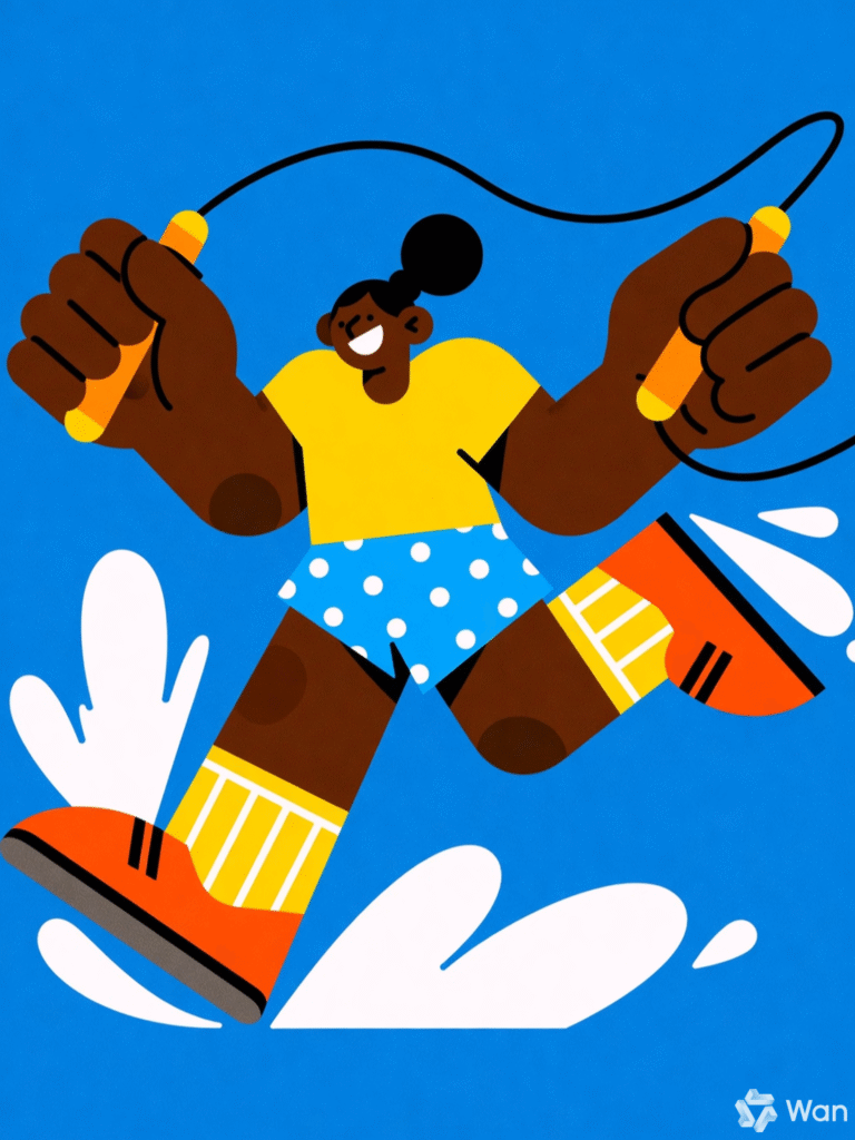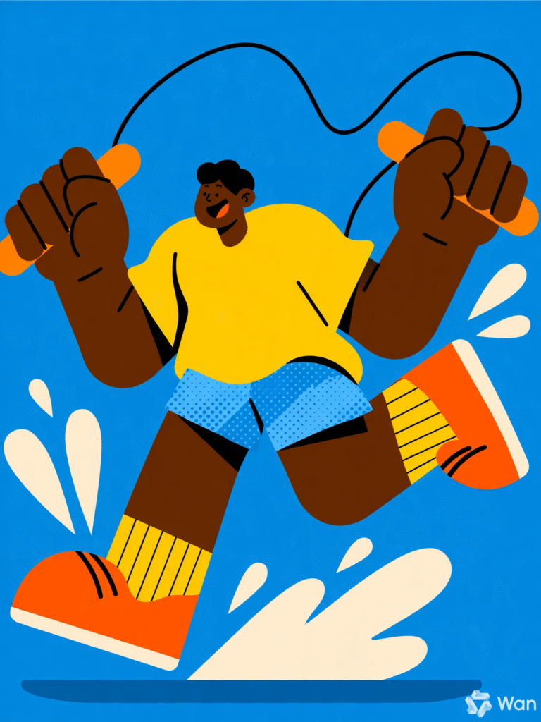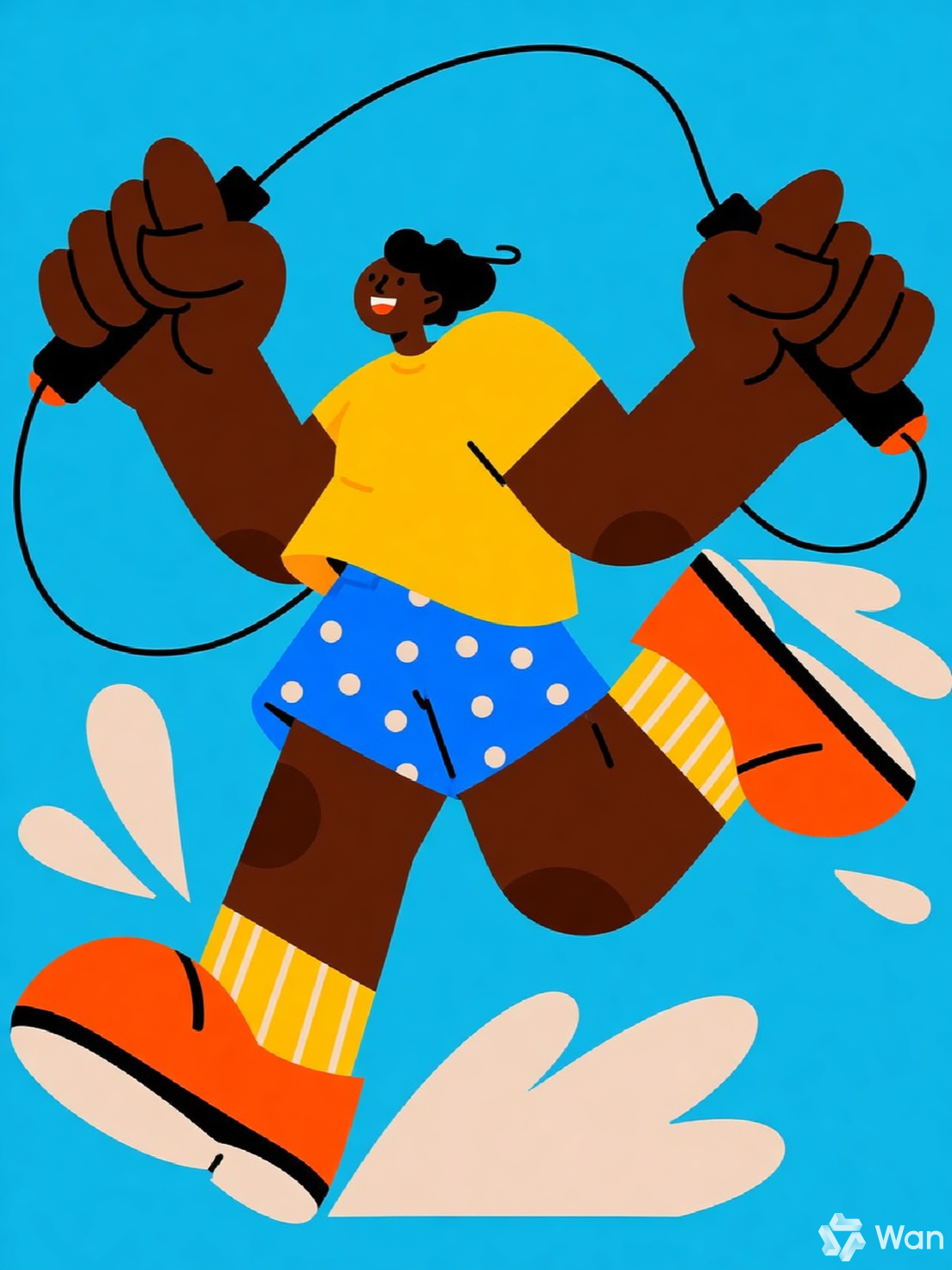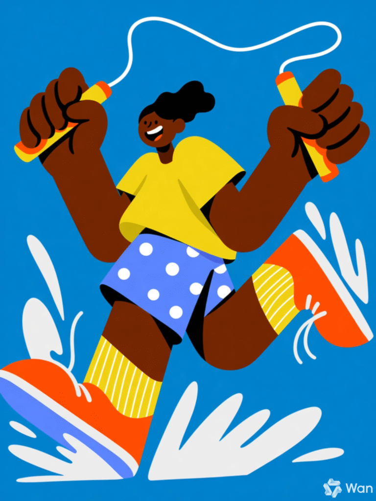 This playful and energetic illustration features a stylized figure mid-jump while skipping rope, set against a solid bright blue background. The character is exaggerated in form, with oversized limbs and a joyful expression, emphasizing motion and vitality. Dressed in a yellow shirt, polka-dot blue shorts, and orange shoes with striped socks, the figure radiates fun and spontaneity. Water splashes around the feet add dynamic texture, reinforcing the sense of movement. The black jump rope arcs above with red handles, framing the action. The overall style is bold, cartoonish, and full of personality—ideal for prompts focused on active characters, whimsical design, or expressive motion.