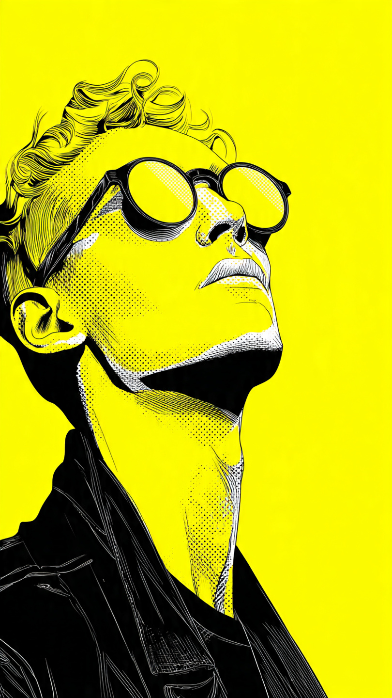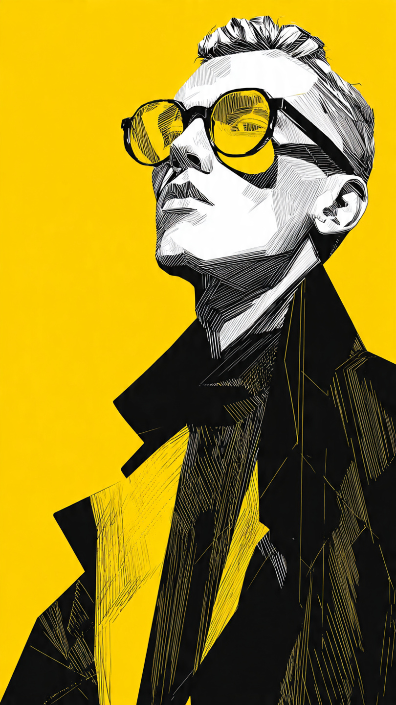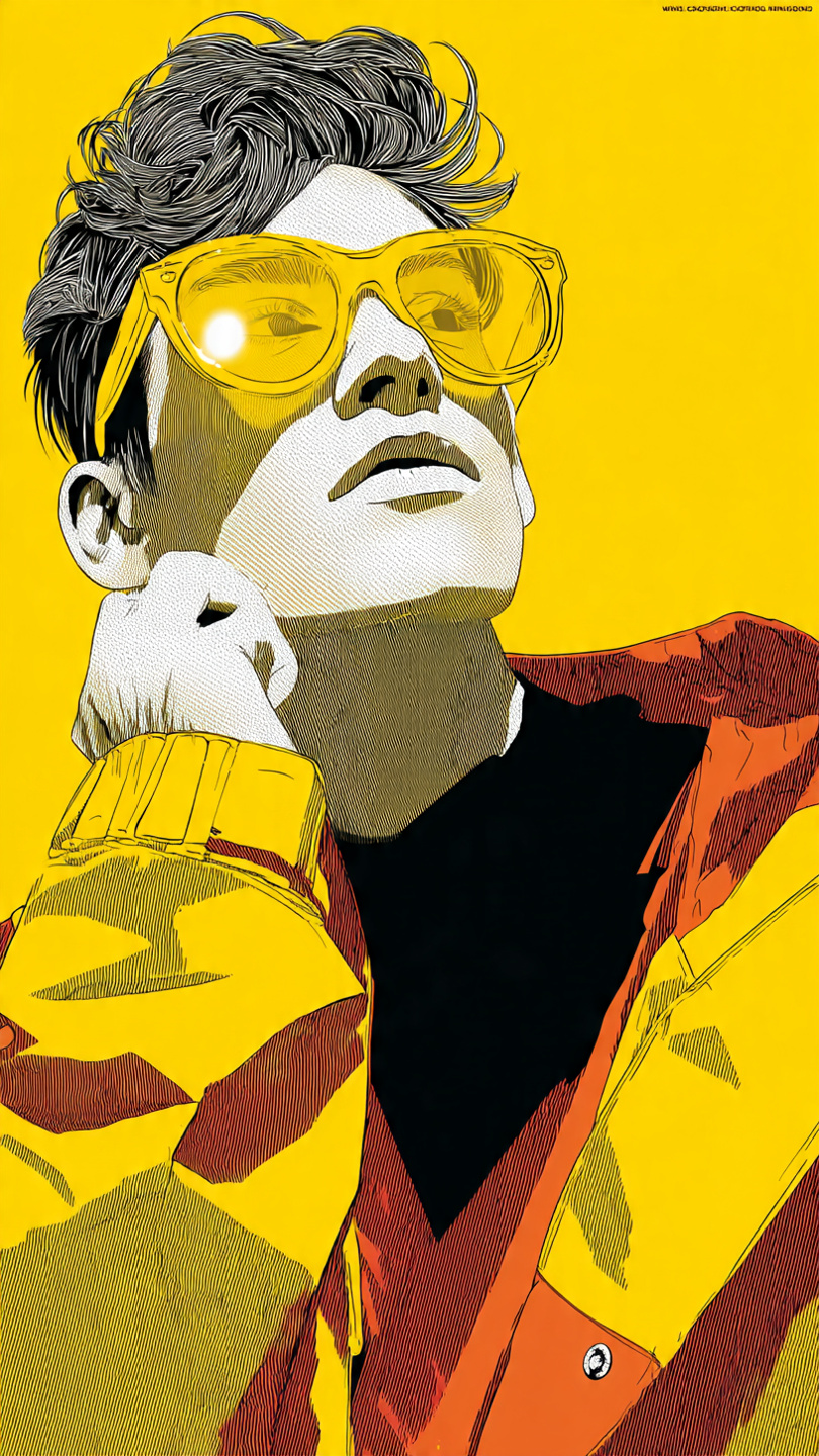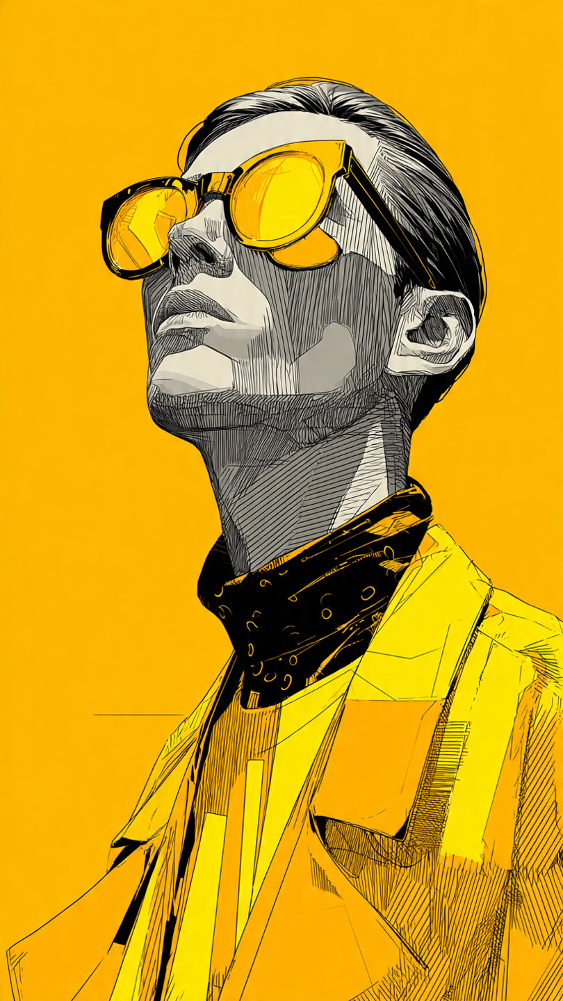 This vibrant illustration showcases a stylized portrait of a person wearing oversized yellow-tinted glasses and a bold yellow-red jacket. The figure strikes a contemplative pose, resting one hand against the face, adding emotional depth to the composition. Set against a solid bright yellow background, the image uses halftone shading and flat color blocks to create texture and visual rhythm. The high-contrast palette and graphic simplicity evoke a retro pop-art vibe with a modern twist. The artwork blends fashion-forward attitude with expressive design, making it ideal for prompts focused on character style, editorial illustration, or bold visual identity.