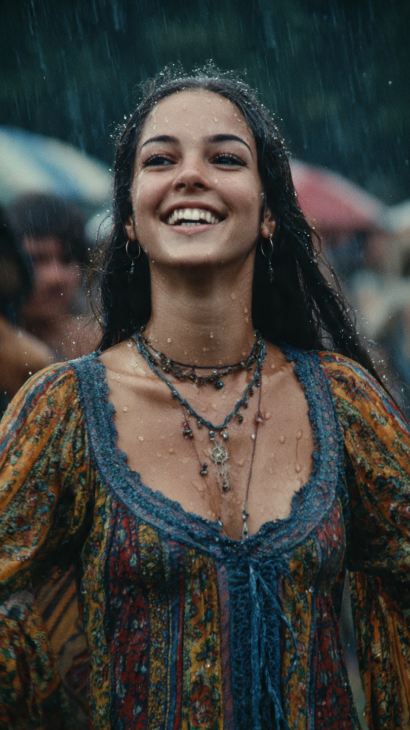 This candid photograph captures a person with long, wet hair styled in two braids, standing outdoors in the rain. Dressed in a patterned dress with a low neckline and a delicate pendant necklace, the subject exudes a natural, relaxed presence. The blurred background hints at a public gathering or festival, adding a sense of spontaneity and shared experience. Raindrops enhance the atmosphere, creating a raw and emotive scene that celebrates authenticity and human connection. The image’s style is documentary-like, with a focus on mood and texture, making it ideal for prompts centered on emotion, realism, and environmental storytelling.