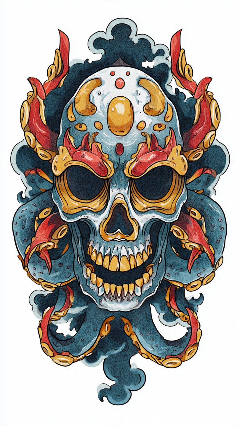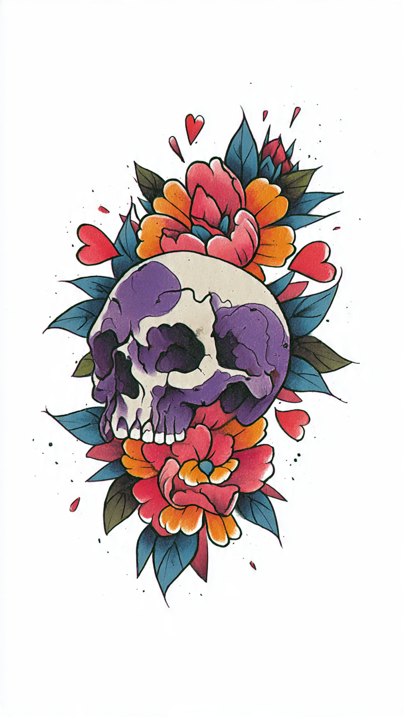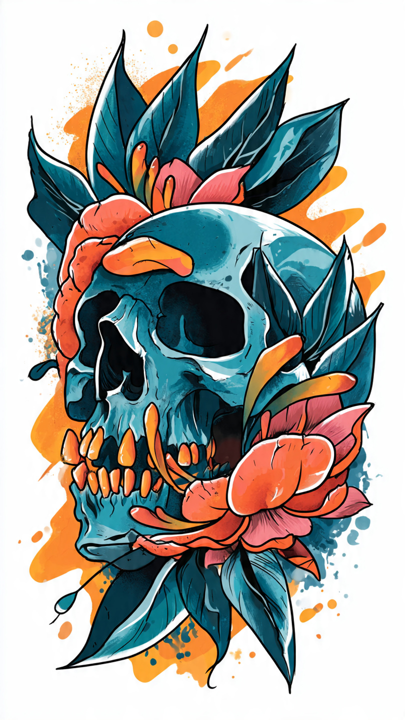 This vibrant tattoo illustration features a richly decorated sugar skull surrounded by an explosion of colorful floral motifs. The design blends traditional Mexican aesthetics with modern tattoo artistry, using bold reds, yellows, purples, and teals to create a festive and symbolic composition. Intricate patterns adorn the skull’s forehead, cheekbones, and jaw, while petal-like shapes frame the eye sockets in vivid contrast. The symmetrical layout and detailed linework evoke themes of remembrance and celebration. The overall style is ornate and expressive, ideal for prompts exploring cultural symbolism, Día de los Muertos iconography, or decorative body art.