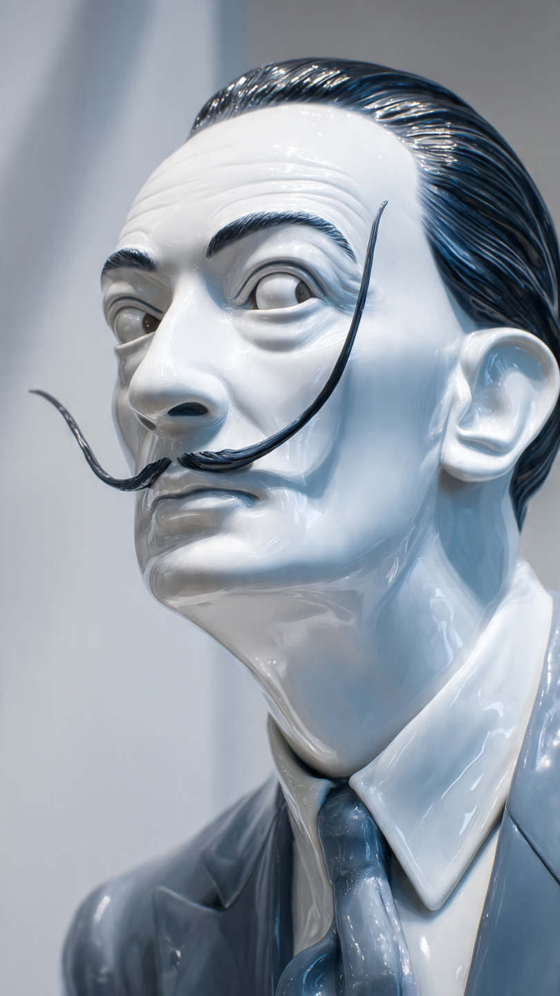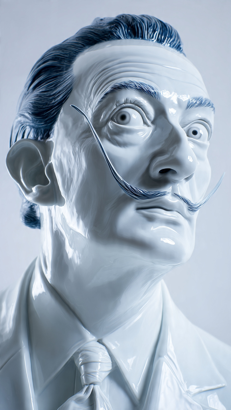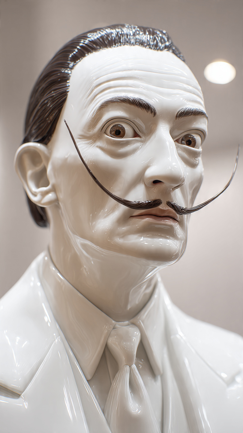 This image depicts a hyperrealistic, porcelain-like bust of a man with a meticulously groomed mustache and an intense, wide-eyed gaze. The sculpture’s surface appears smooth, glossy, and almost translucent, giving it a surreal and lifelike quality at once. The lighting is cold and diffused, enhancing the reflective highlights that accentuate the contours of the face and suit. Every detail—from the hair texture to the folds of the tie—feels sculpted rather than photographed, blurring the line between digital art, photography, and sculpture. The overall aesthetic evokes a modern reinterpretation of classic portraiture infused with surreal precision, where artificial perfection meets expressive eccentricity.