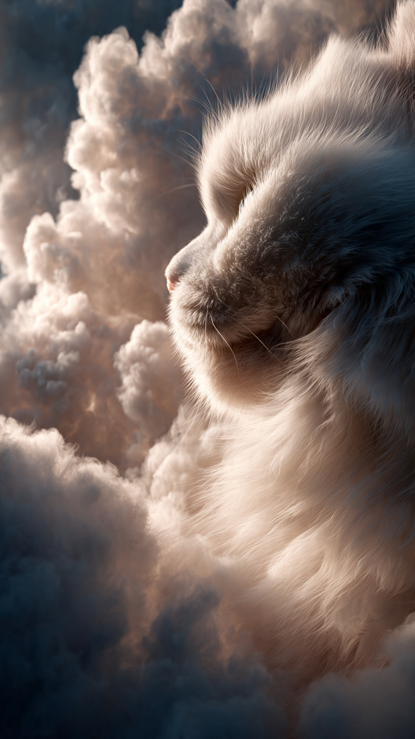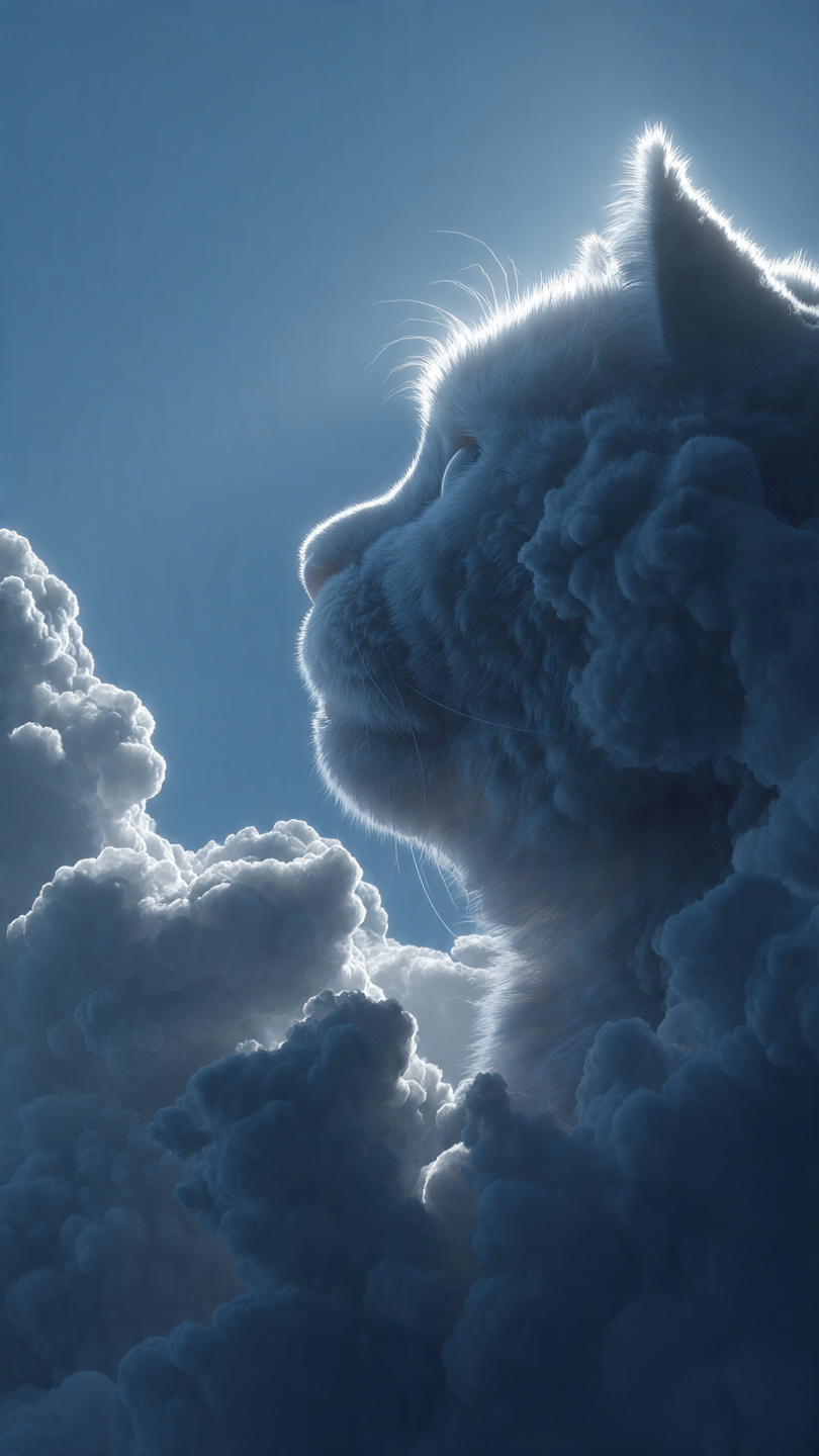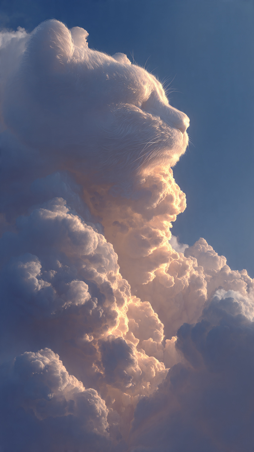 This dreamlike image portrays a massive, fluffy cat seamlessly formed from glowing clouds, illuminated by the warm light of a setting or rising sun. The scene blends realism and fantasy, with detailed textures that make the feline’s fur and the surrounding vapors appear soft and tangible. The golden light gently outlines the cat’s features, while the deep blue sky in the background enhances the ethereal contrast between shadow and glow. The composition evokes a sense of serenity, wonder, and imagination—turning a simple sky scene into a poetic vision where nature and fantasy merge..