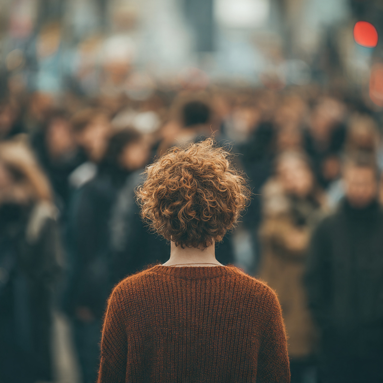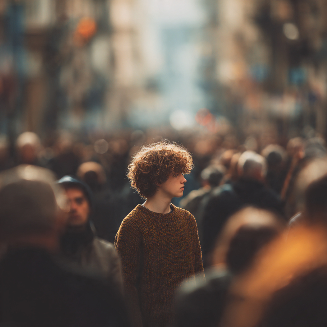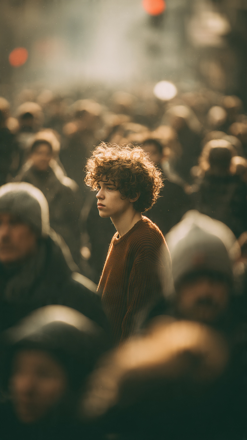 This photograph captures a cinematic moment in a bustling urban street. The scene is filled with blurred figures in motion, evoking the energy and anonymity of city life. At the center, a young person with curly hair and a rust-colored sweater stands out in sharp focus, bathed in soft natural light. The contrast between the focused subject and the surrounding blur creates a powerful sense of isolation and introspection. The composition and lighting lend a contemplative, almost film-like quality to the image, emphasizing individuality within the crowd. Ideal for prompts exploring urban solitude, emotional contrast, or character-driven storytelling.
