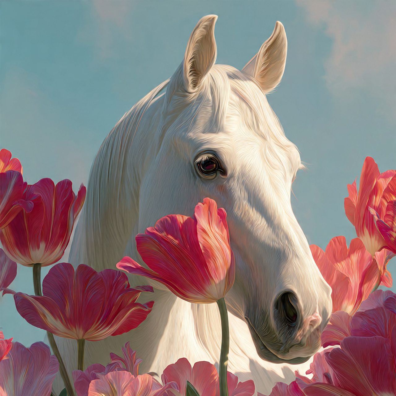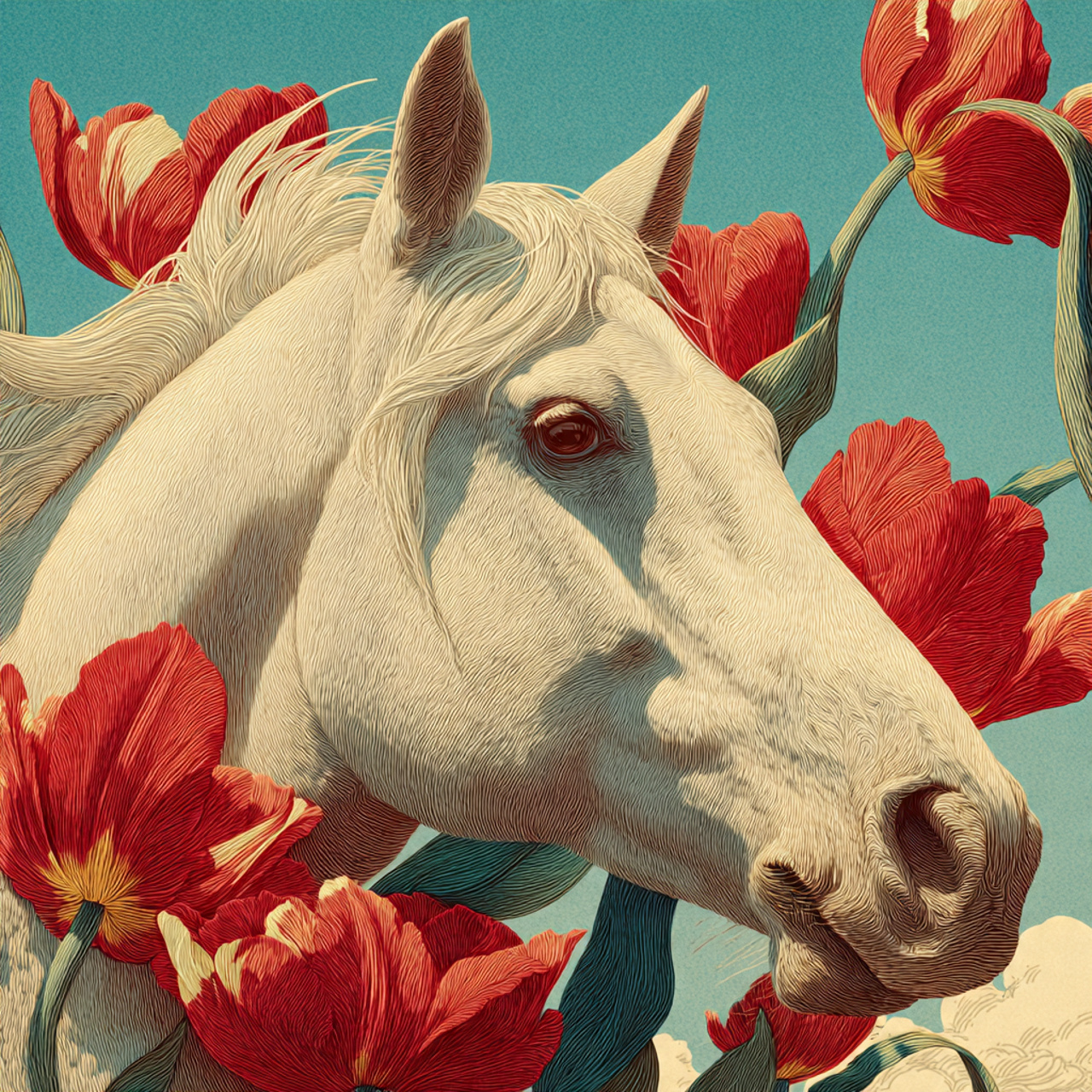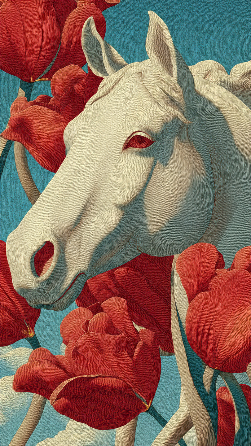 This surreal and elegant illustration features a white horse’s head surrounded by oversized red and white flowers, set against a soft blue background. The horse is rendered with fine, delicate lines that highlight the texture of its fur and the graceful contours of its face. The flowers—resembling tulips and lilies—are richly colored and intricately detailed, creating a vivid contrast with the pale coat of the horse. The composition blends realism with fantasy, evoking a dreamlike atmosphere. The smooth gradients and harmonious palette give the image a refined, airbrushed quality. Ideal for prompts exploring nature, surreal beauty, or animal symbolism in art.