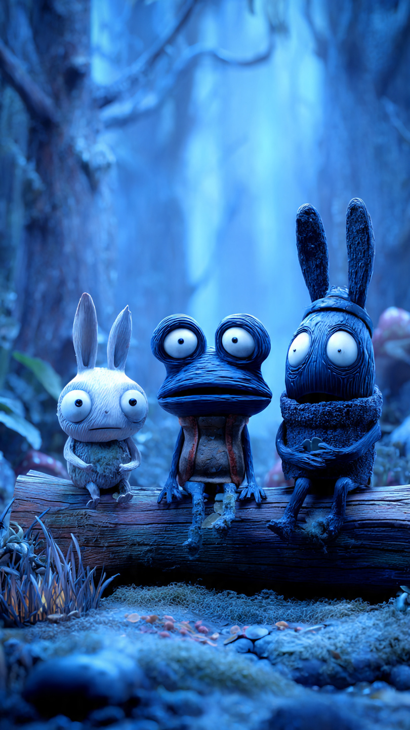 This whimsical forest scene features three stylized animal characters perched on a moss-covered log. Each figure is uniquely designed: a blue frog-like creature with bulging eyes and textured skin, a small bird with a feathered cap in soft blue and white tones, and a wide-eyed black-and-white rabbit with a plush, furry appearance. The forest floor is rich with detail—mushrooms, pebbles, and lush greenery contribute to the enchanted woodland atmosphere. The background is softly blurred, drawing attention to the expressive characters in the foreground. The image blends fantasy and realism through detailed modeling or digital rendering, evoking a playful, storybook charm. Perfect for prompts centered on magical creatures, forest adventures, or imaginative character design.