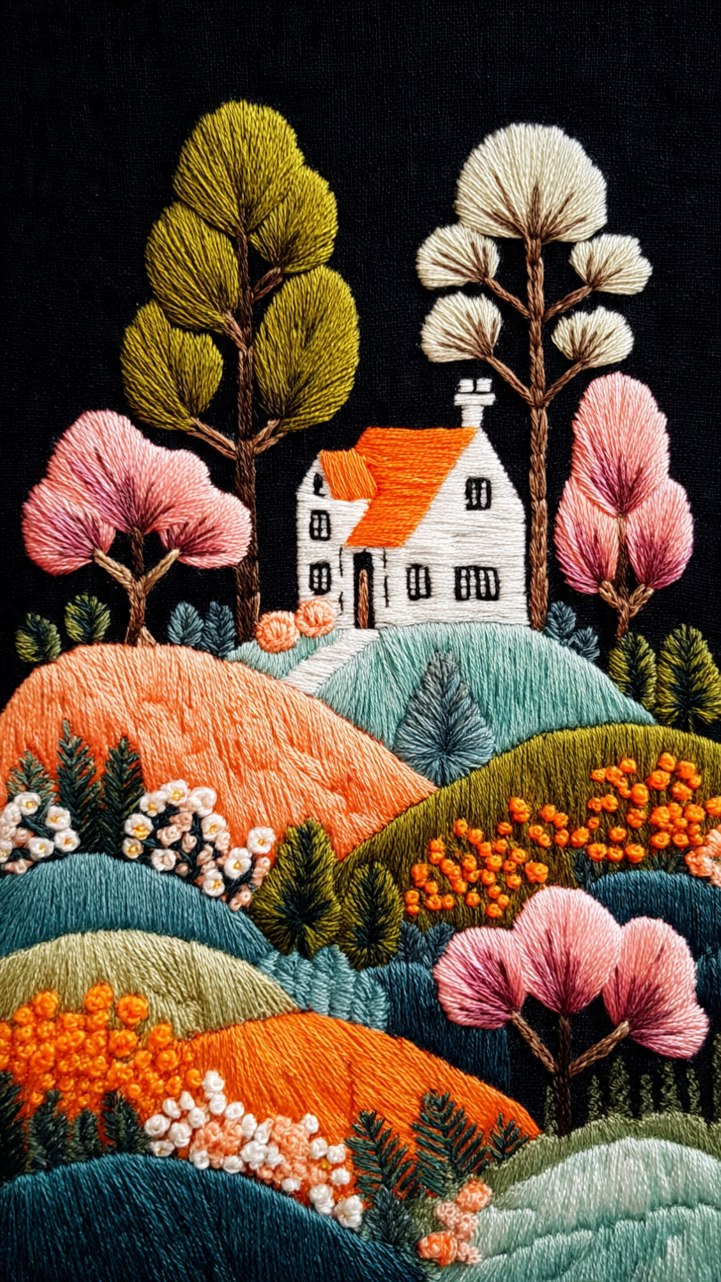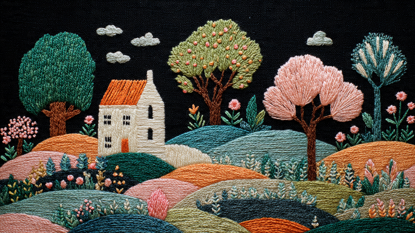 This handcrafted embroidery artwork portrays a landscape deeply engaged in reading, rendered entirely with thread and fabric. The style is hyper-detailed and tactile, blending realism with artisanal charm. Set against a plain fabric canvas, the composition emphasizes craftsmanship and intimacy. The use of varied thread textures and colors brings depth and warmth, making the piece feel both lifelike and cozy. Ideal for prompts exploring handmade art, quiet moments, or textile storytelling.