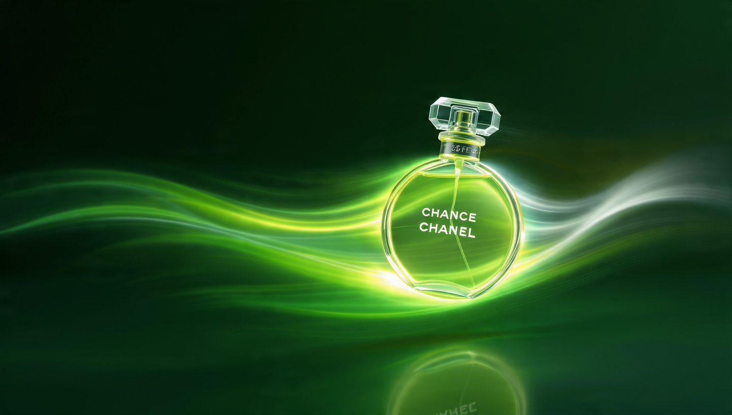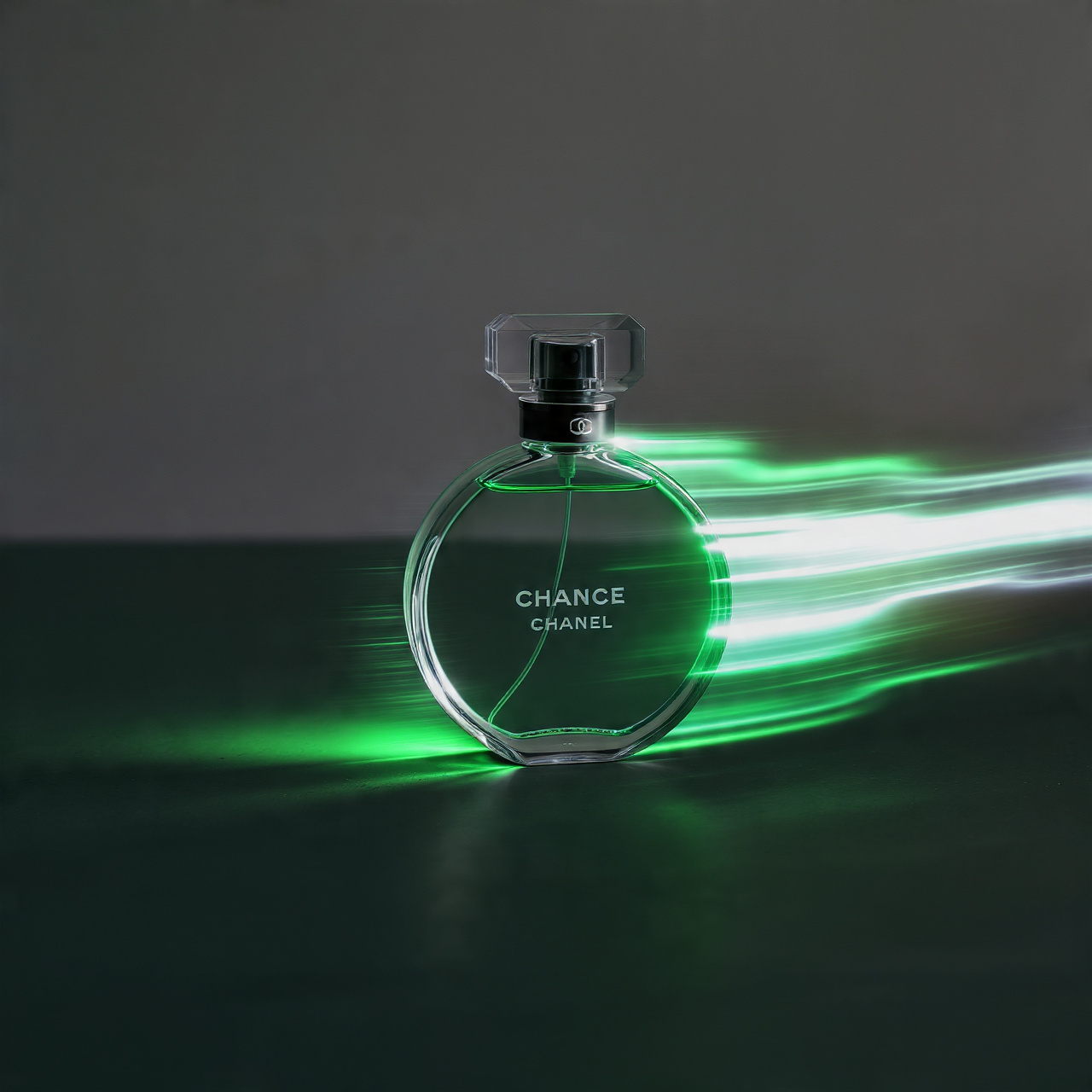 This striking product photograph features a round CHANEL perfume bottle illuminated by a vivid green light streak that sweeps across the frame from left to right. The bottle’s transparent glass and faceted cap catch the light dramatically, creating reflections and highlights that emphasize its luxury design. The background is deep black, enhancing the contrast and making the green motion blur appear almost electric. The composition blends elegance with kinetic energy, giving the image a futuristic and high-end editorial feel. Ideal for prompts focused on luxury branding, dynamic lighting, or modern product photography.